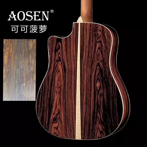 可可菠萝(Cocobolo),黄檀木,制作出来的吉他声音十分丰富饱满,拥有美妙的泛音,低音共鸣十足,有充沛的音量,人们经常将之与巴西玫瑰木一比高下,这种材料木质坚硬、耐用,深橙色间有黑色条纹及其漂亮,一把好吉他浑然天成。