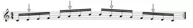 注:熟练后还要做更多的八分音符音阶练习(节拍器在后半拍)、十六分音符音阶练习(节拍器在第三个十六分音符)。