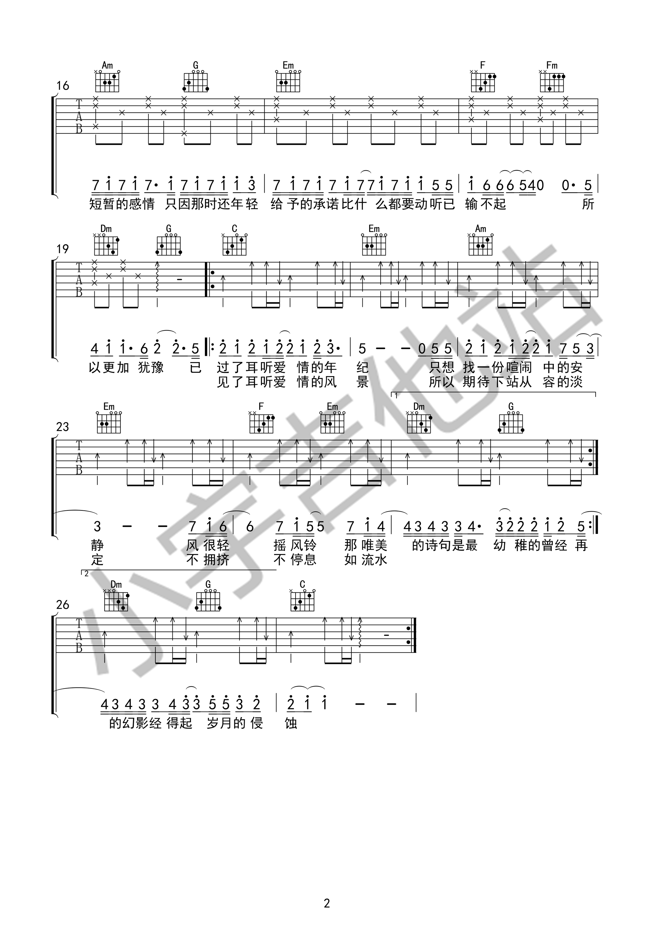 原调F调,吉他谱调为C调指法,节拍为4/4拍,弹唱可变调夹夹5品。