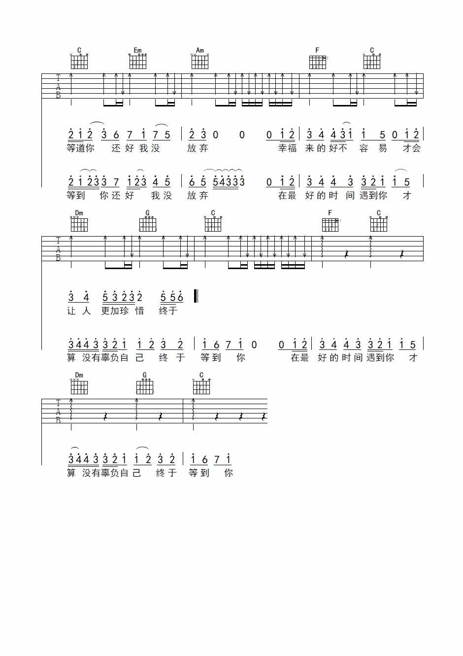 《终于等到你》吉他谱_张靓颖_C调弹唱六线谱