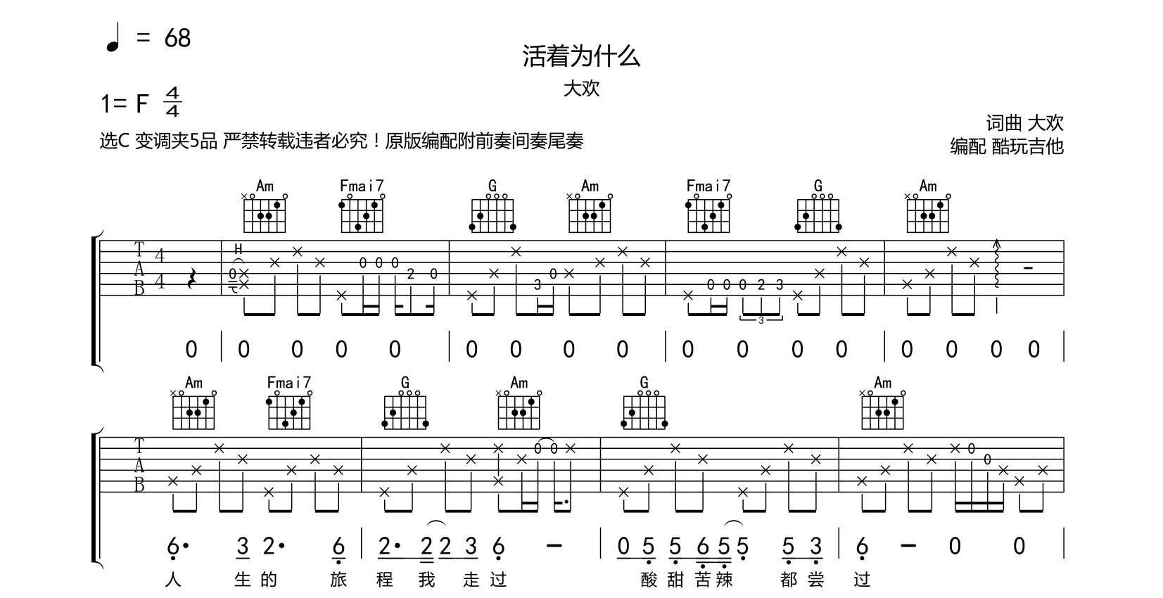 活着为什么吉他谱-大欢-C调六线谱弹唱谱选C变调夹5品原版编配附完整前奏间奏尾奏并手机完整录制音频录制没有重复自己演奏请按重复段落演奏