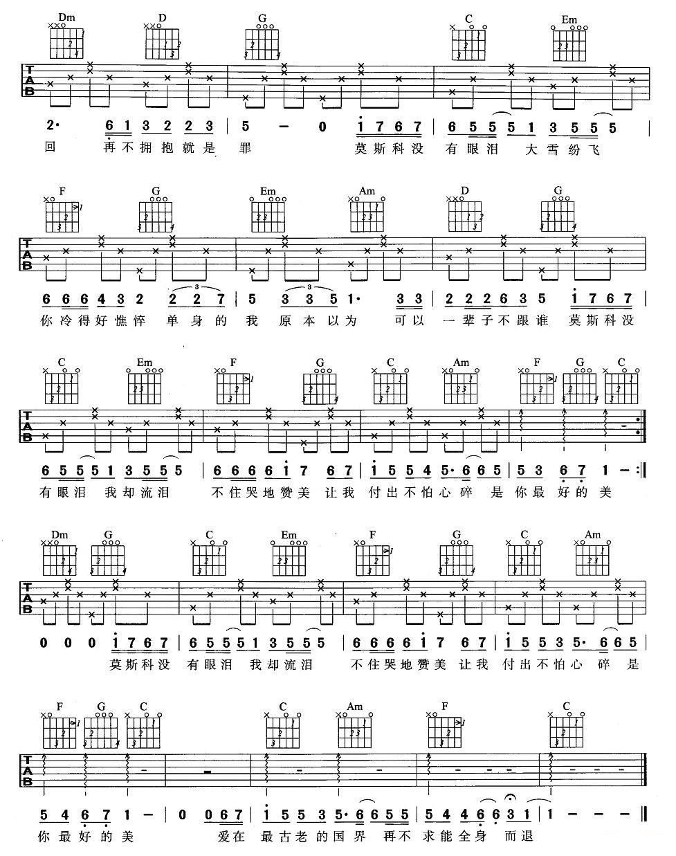 Twins《莫斯科没有眼泪》吉他谱-C调弹唱谱六线谱