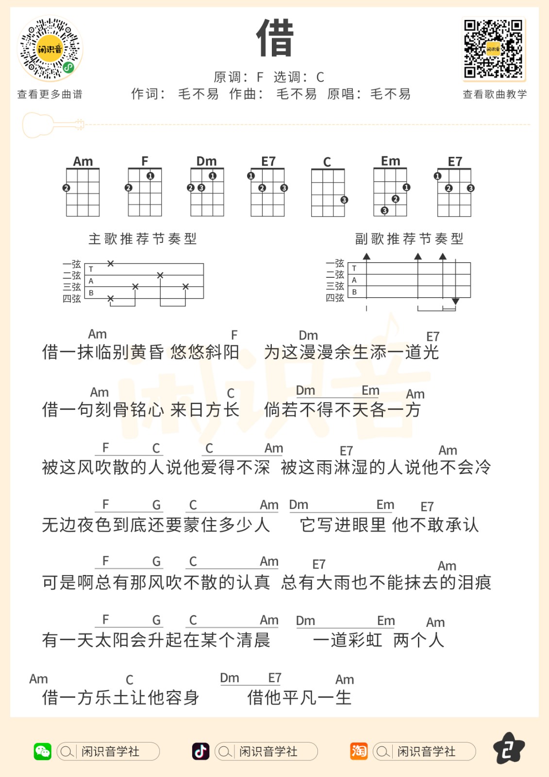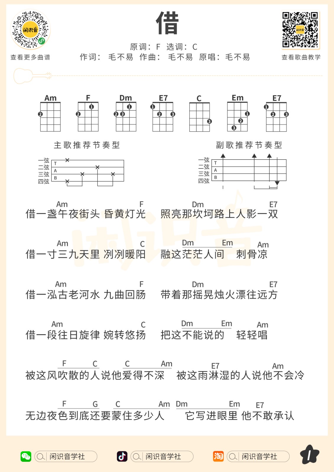 毛不易《借》尤克里里曲谱-C调弹唱谱