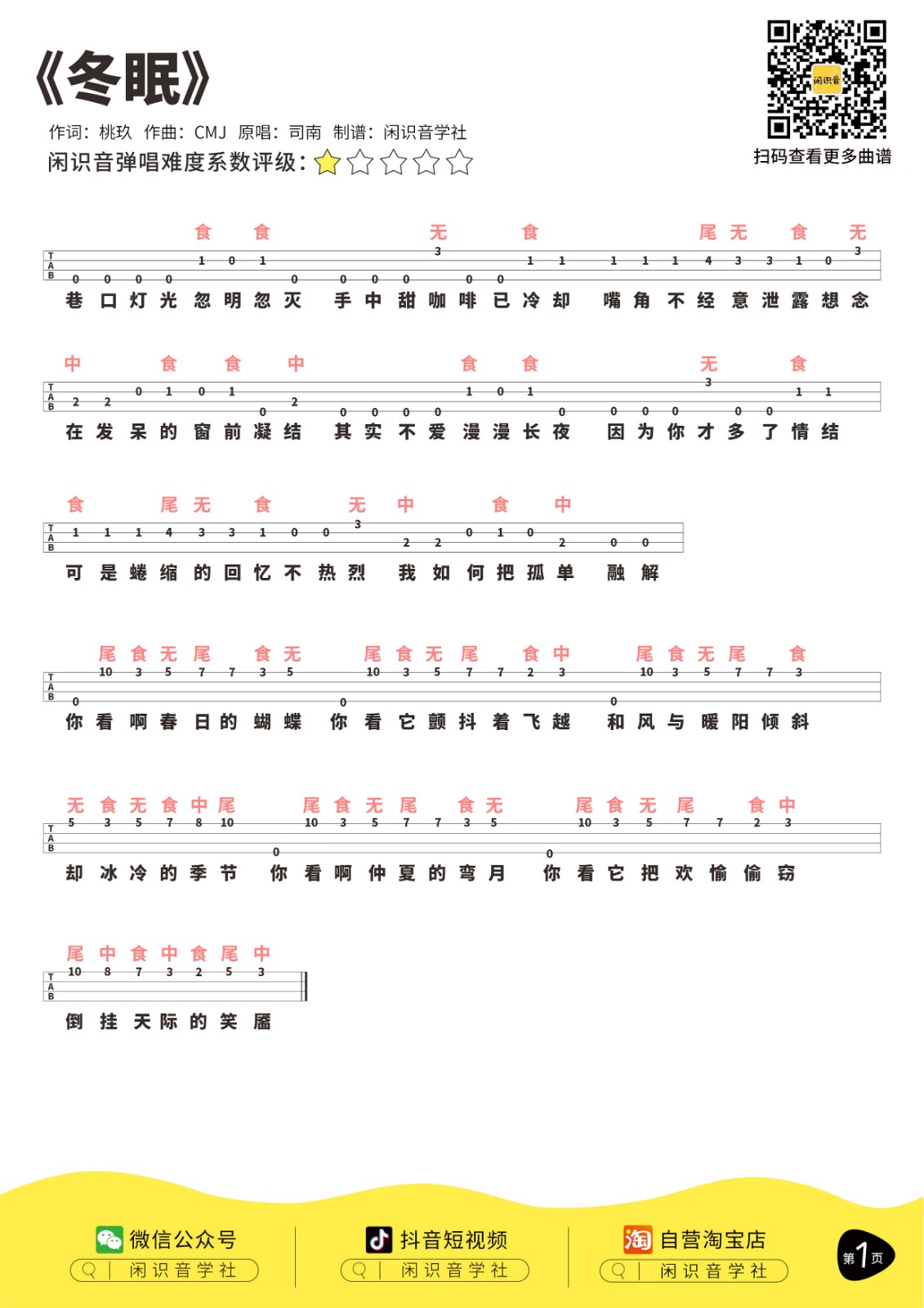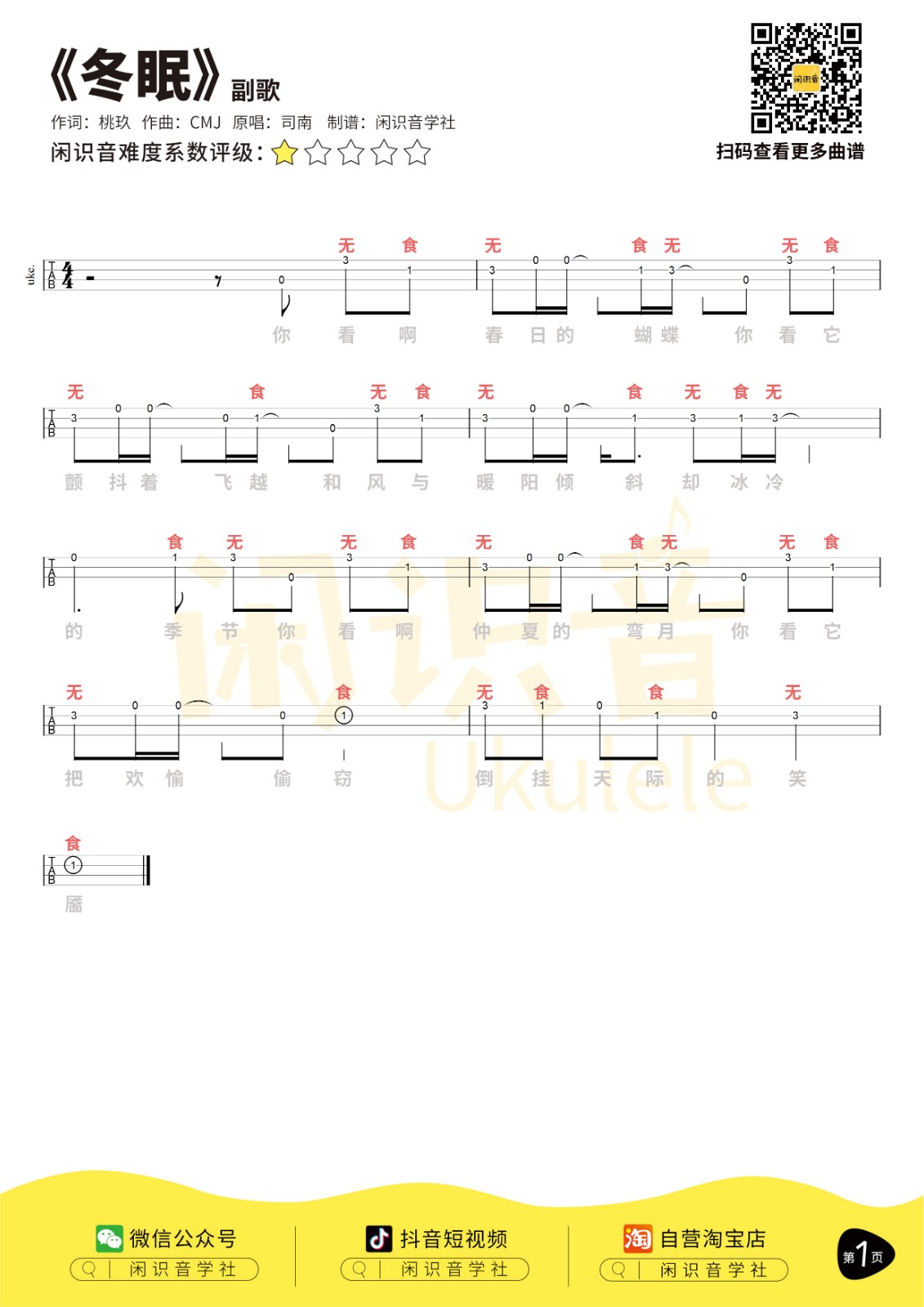 司南《冬眠》尤克里里曲谱-G调指弹谱