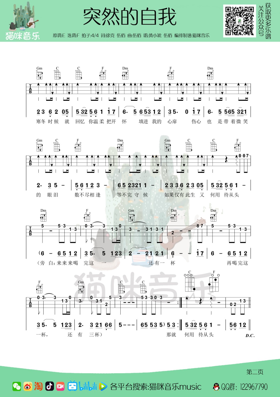 伍佰《突然的自我》尤克里里完整弹唱谱-F调弹唱谱