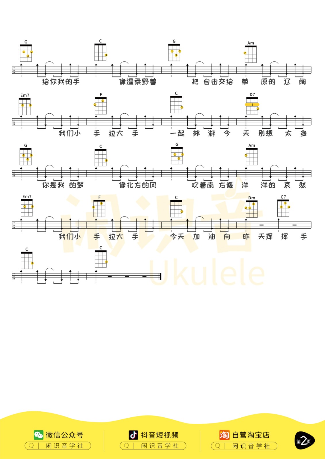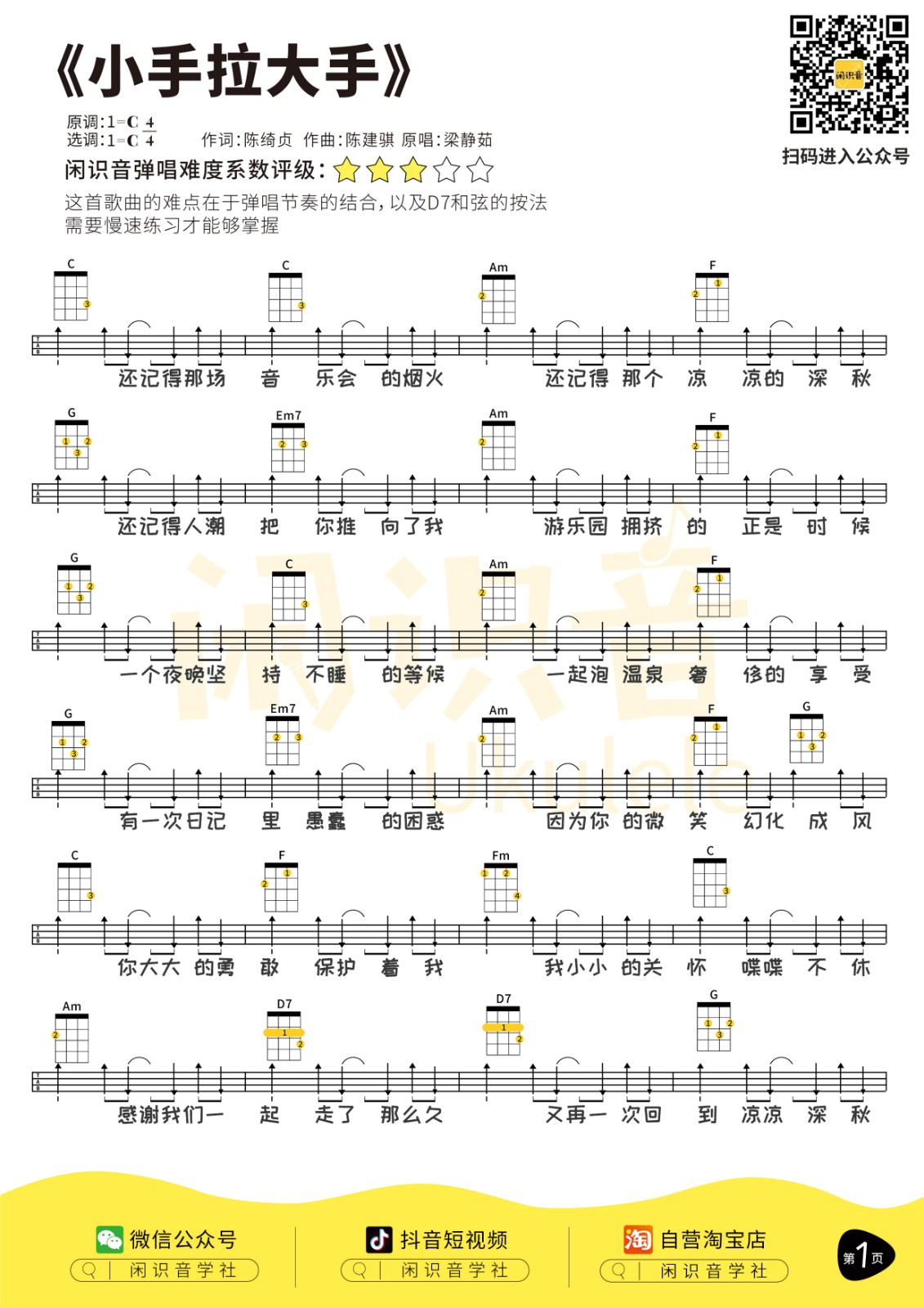 梁静茹《小手拉大手》尤克里里曲谱-C调完整弹唱