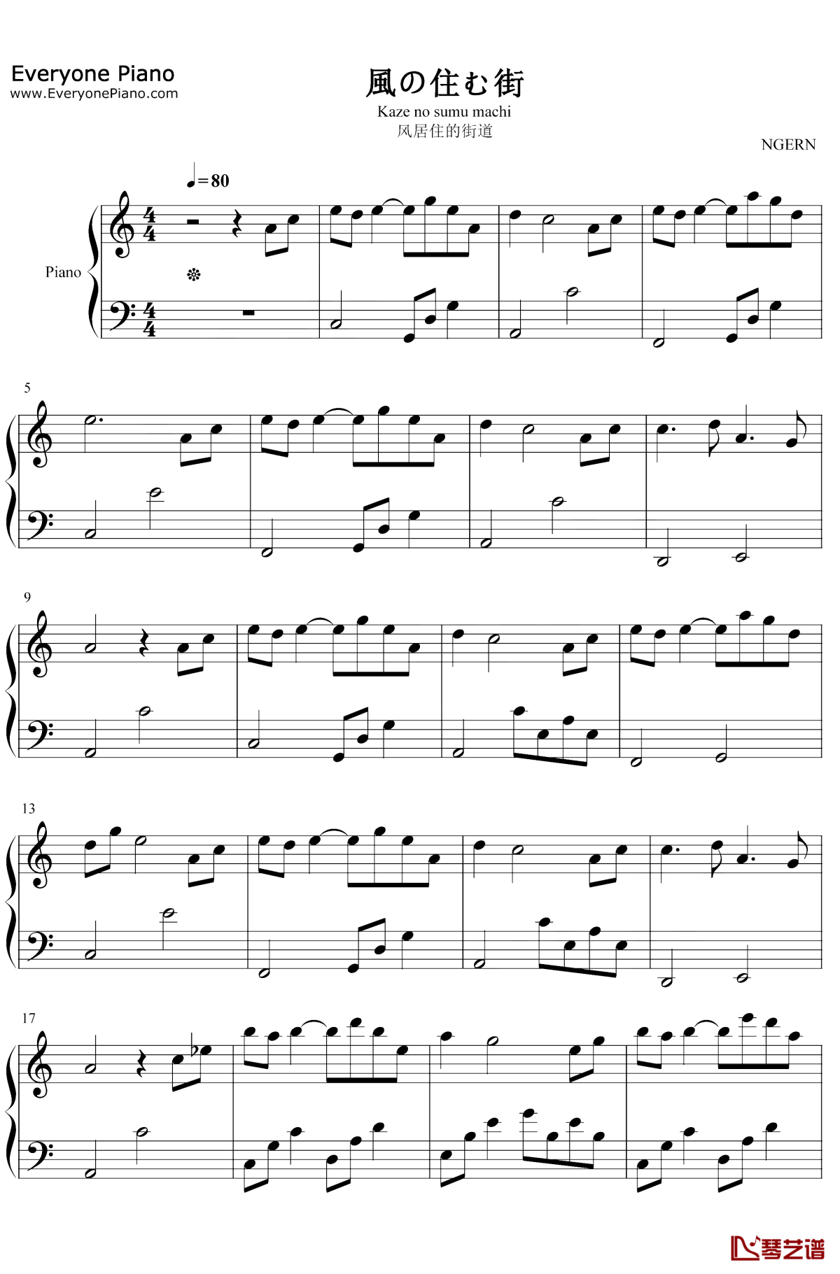 矶村由纪子《风居住的街道》钢琴谱-C调简单版