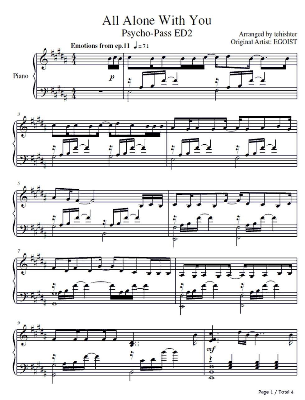 《心理测量者》片尾曲《All Alone With You》钢琴谱