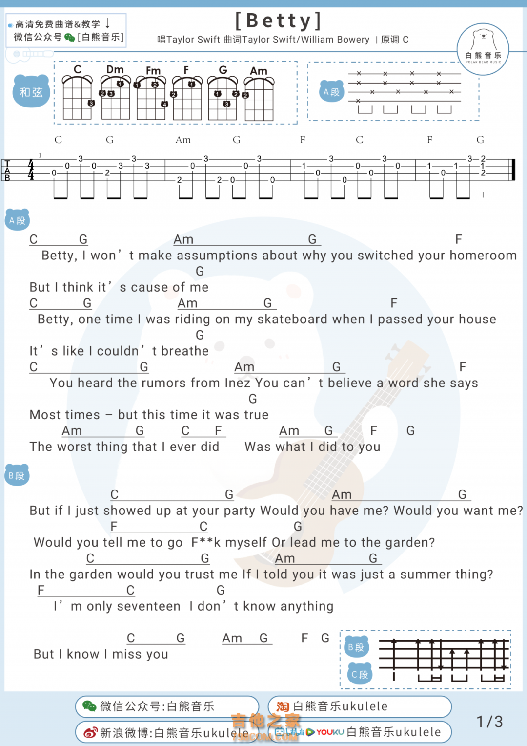 TaylorSwift《betty》尤克里里谱-C调和弦弹唱谱