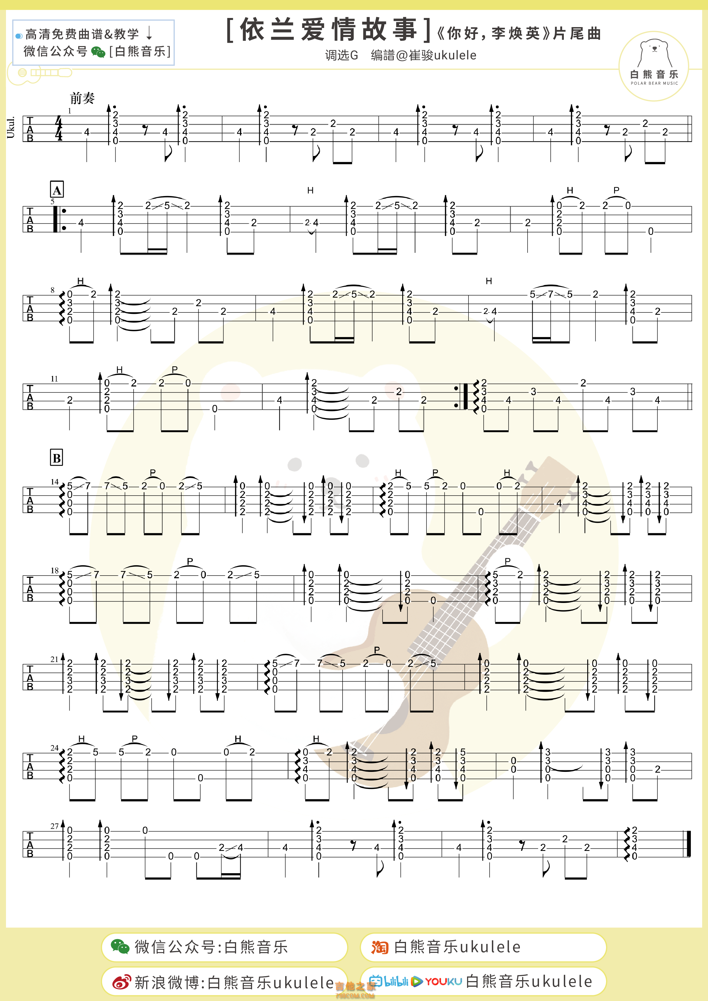依兰爱情故事尤克里里指弹谱白熊音乐
