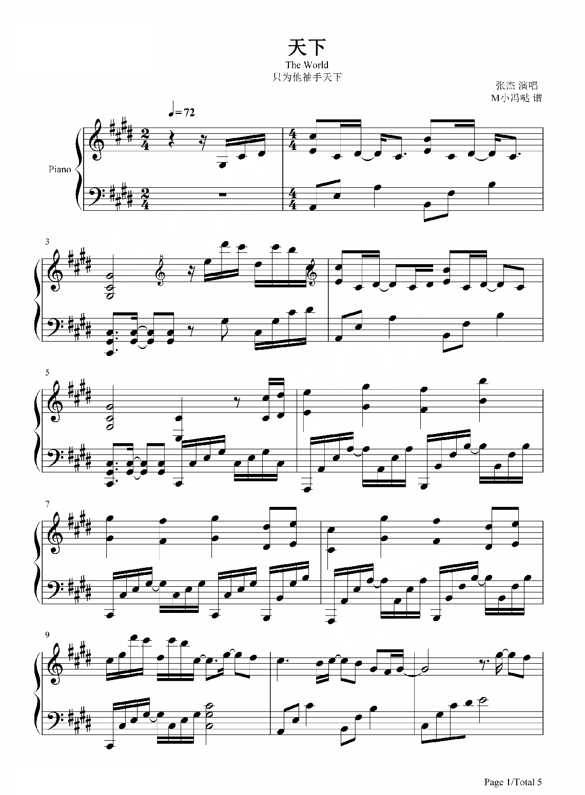 张杰《天下》钢琴谱