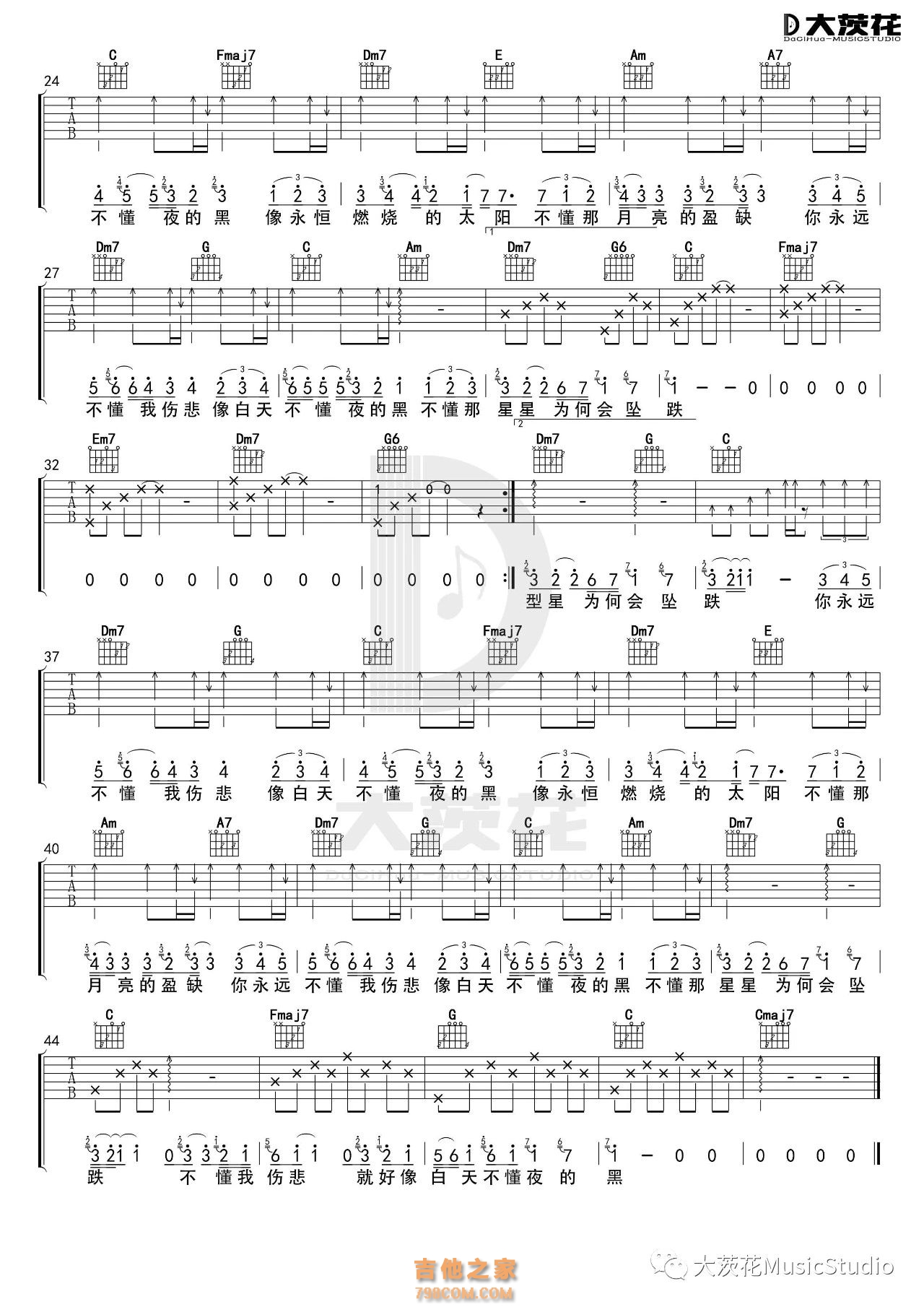 白天不懂夜的黑吉他谱 大茨花