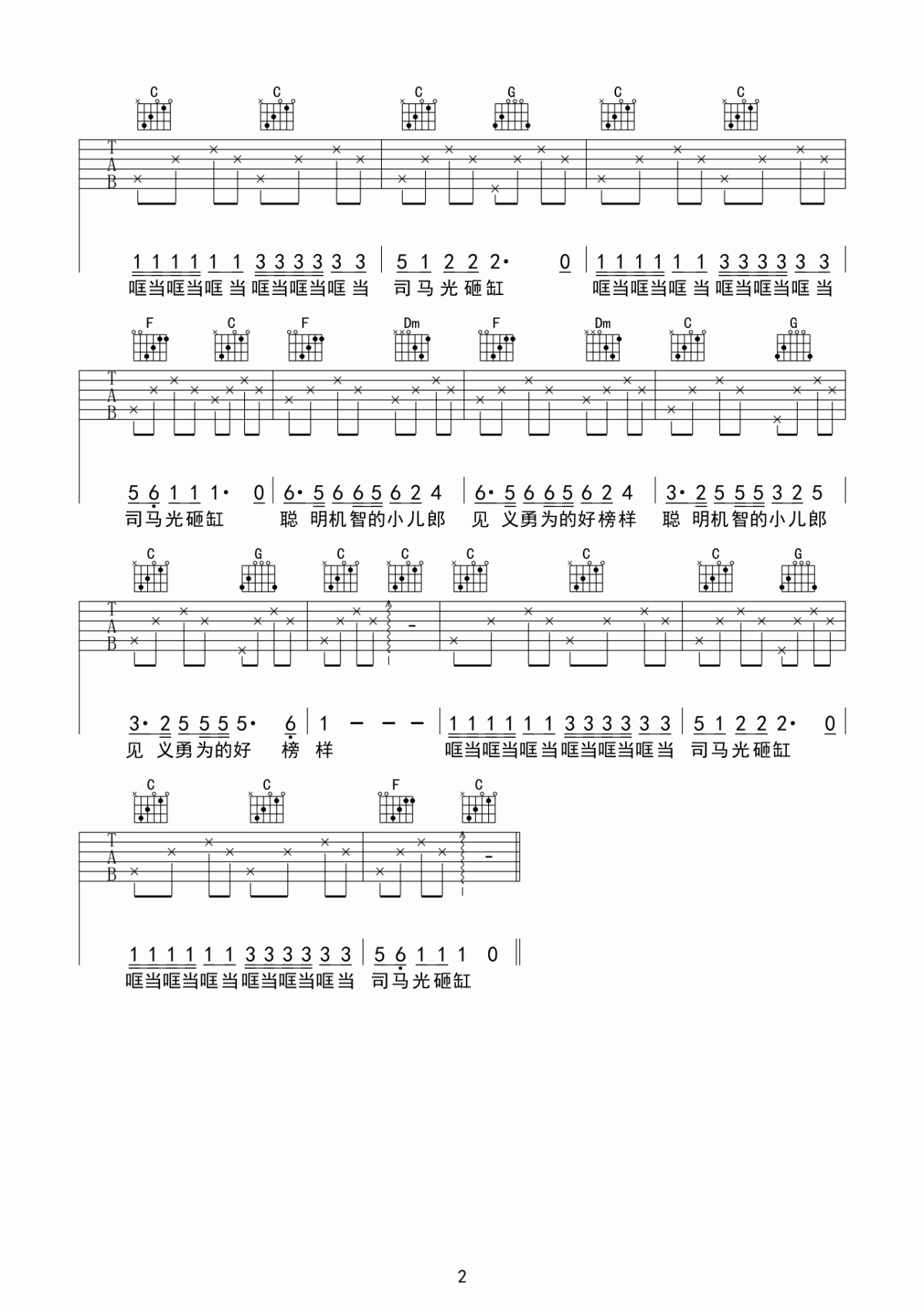 《司马光砸缸》吉他谱,采用C调指法编配,共有2张高清图谱,免翻页排版设计。