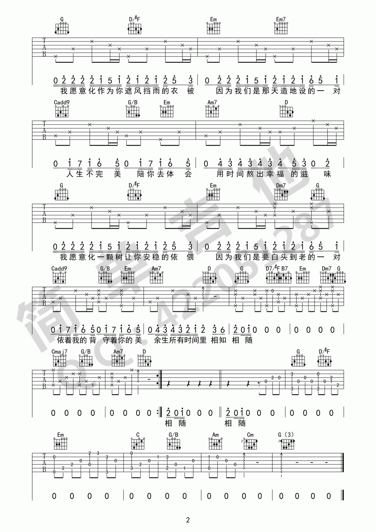 天造地设吉他谱 G调 简单版 胖胖胖