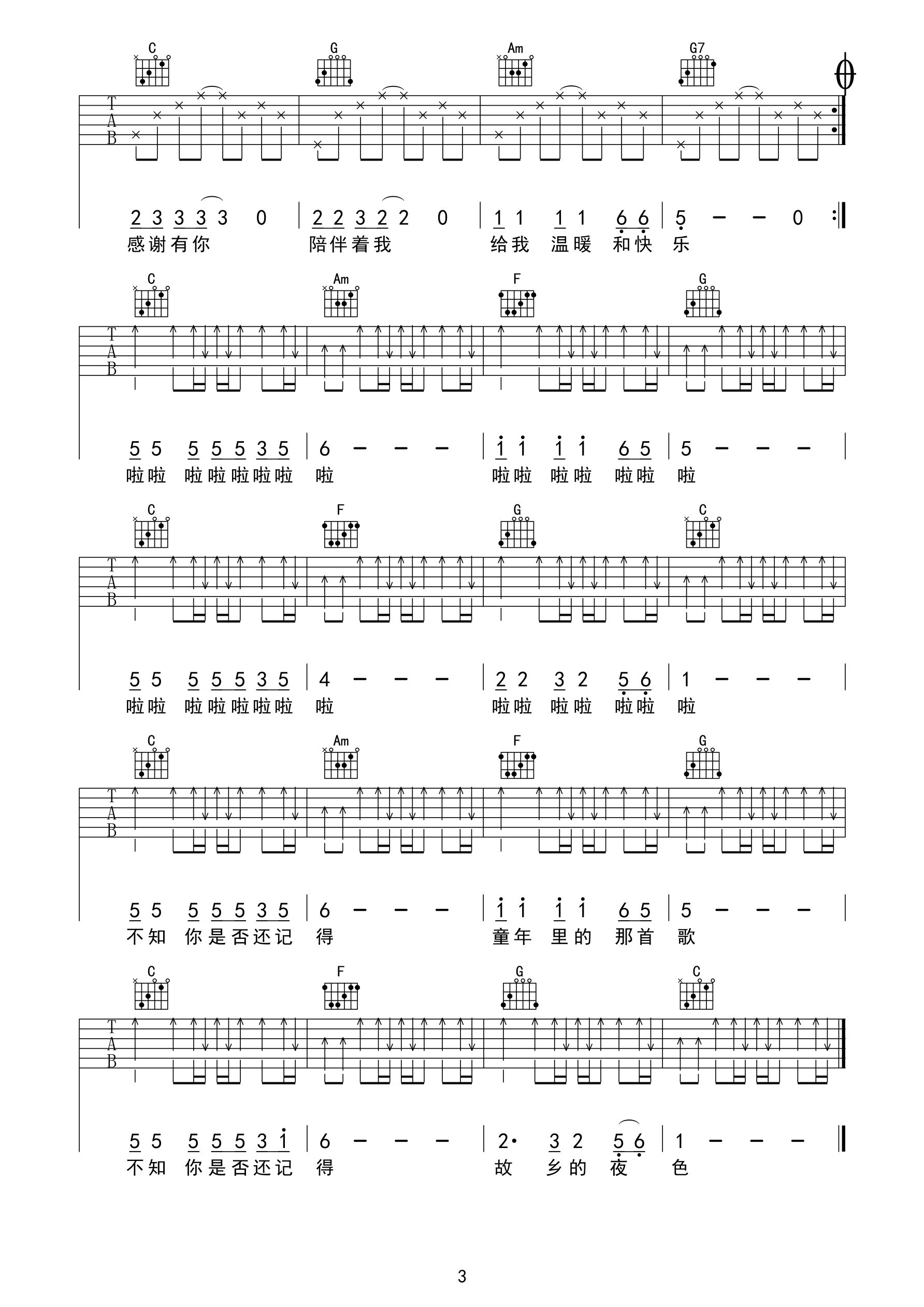 《童年故乡》吉他谱,采用C调指法编配,共有3张高清图谱。
