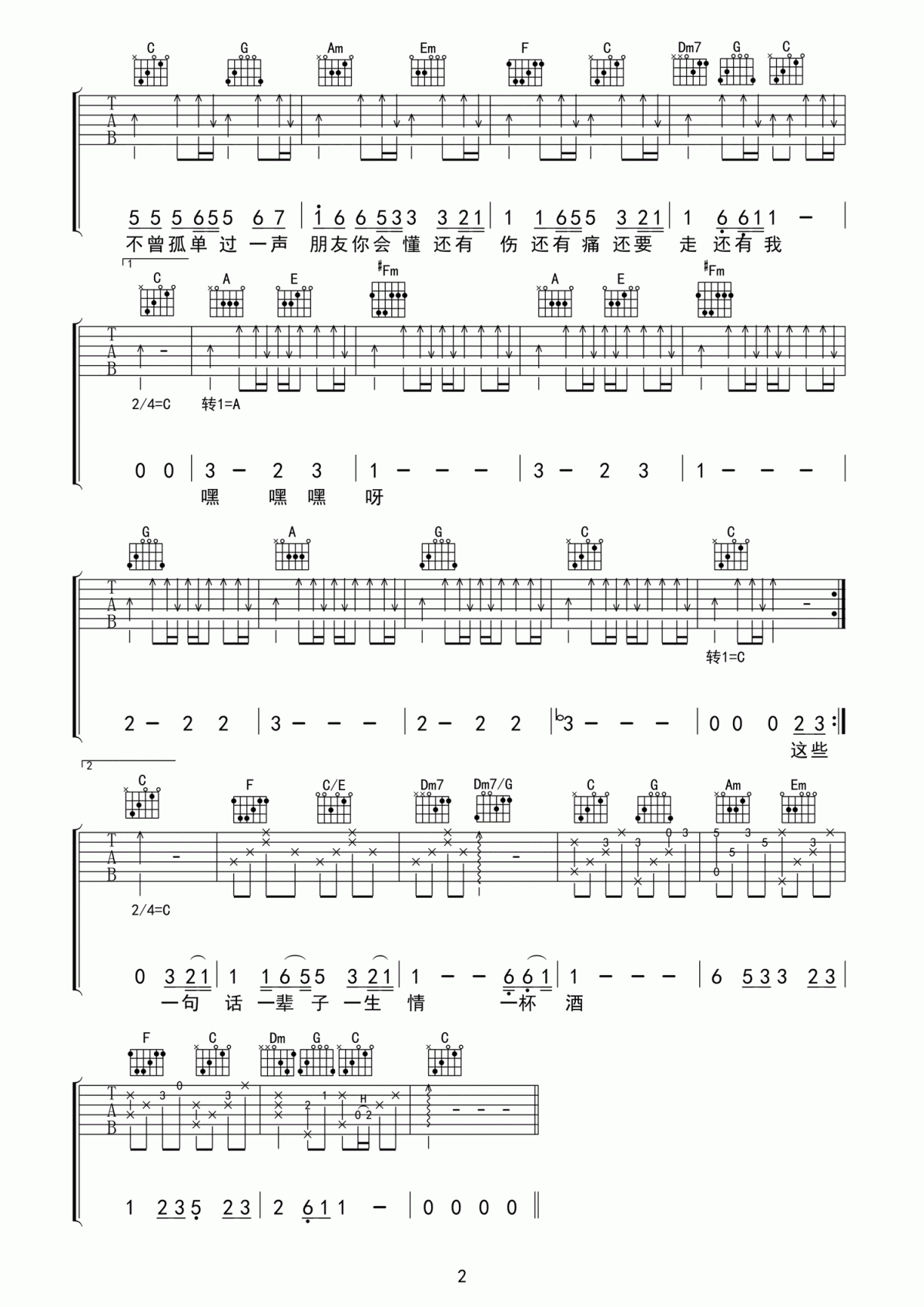 《朋友》吉他谱,采用C调指法编配,共有2张高清图谱,免翻页排版设计。