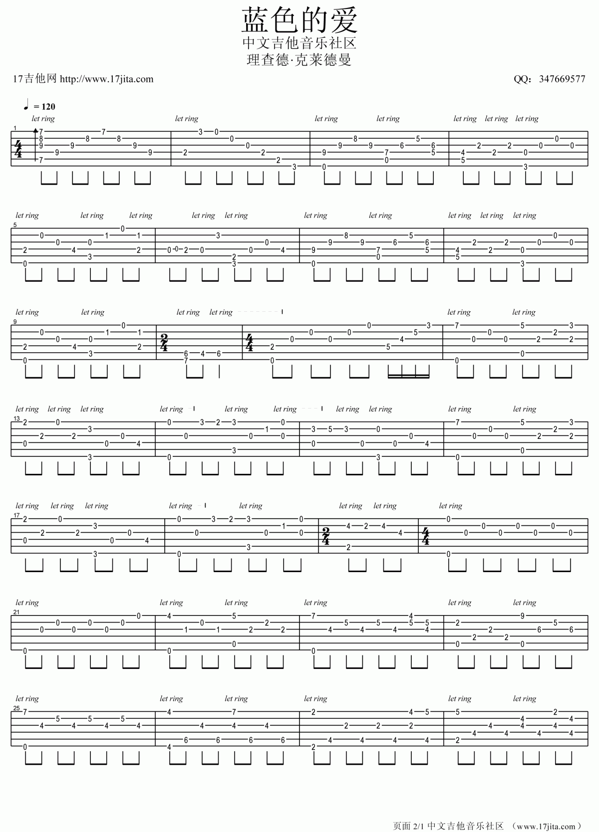 理查德·克莱德曼 蓝色的爱吉他谱