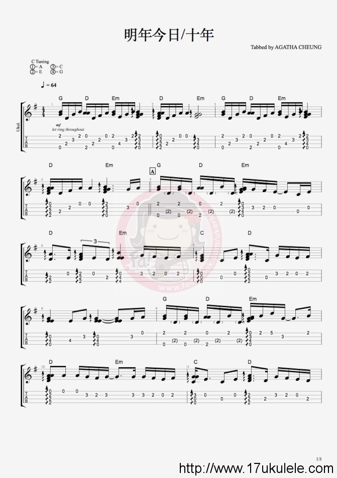 《明年今日/十年》尤克里里谱,共有3张高清图谱。