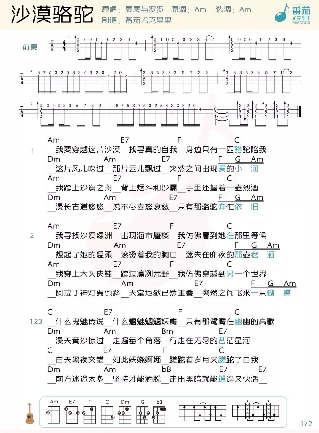 《沙漠骆驼》尤克里里谱弹唱版 A调附前奏_番茄尤克里里编配_展展与罗罗