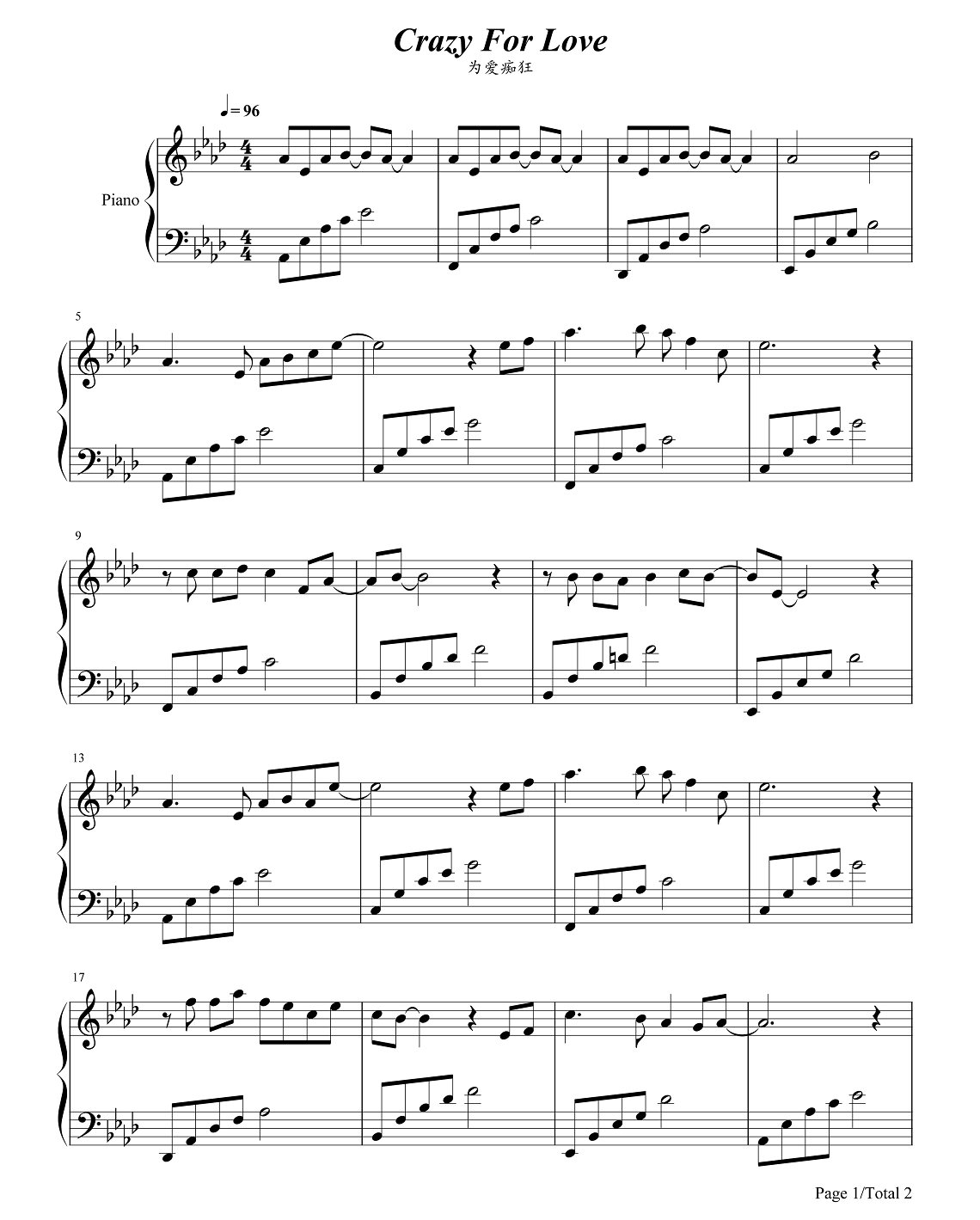 刘若英《为爱痴狂》钢琴谱