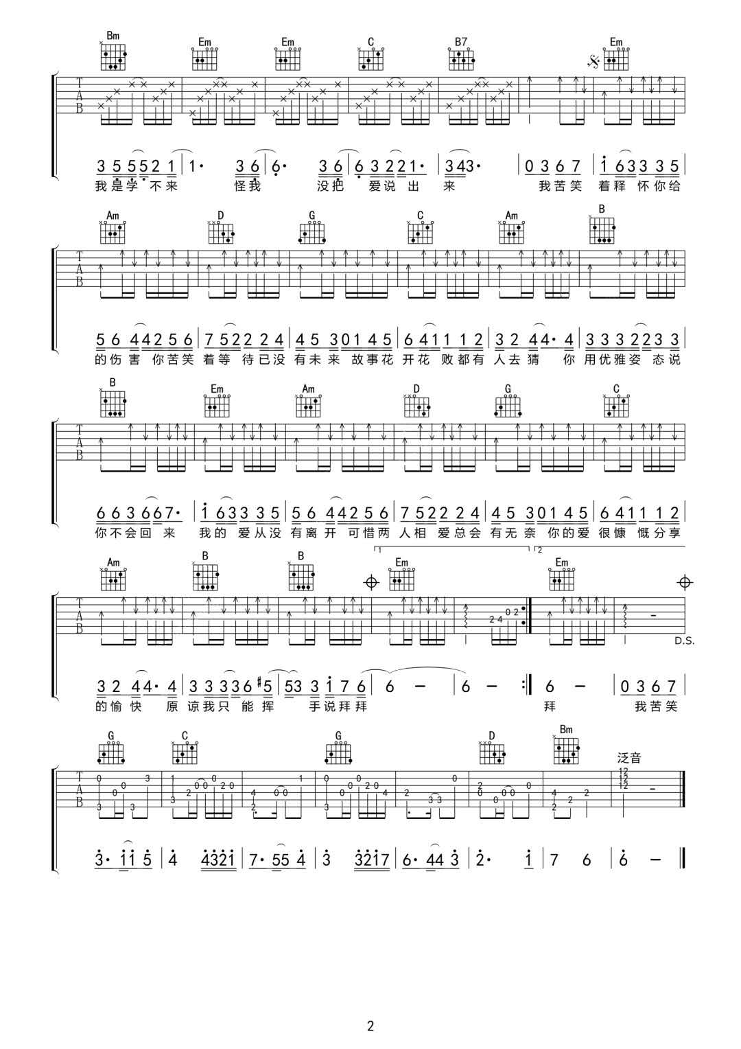 汪苏泷《苦笑》G调原版吉他谱