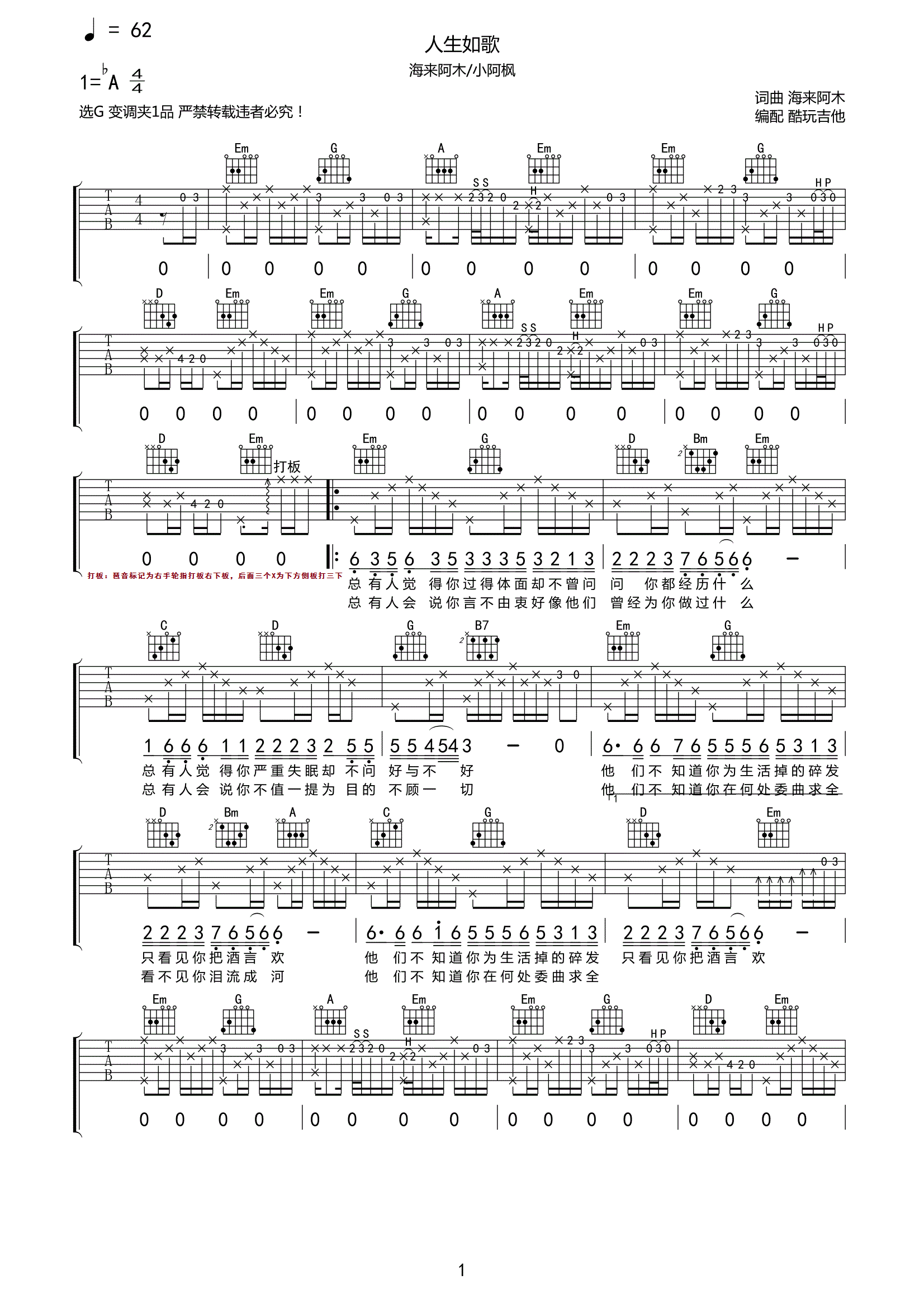 海来阿木/小阿枫《人生如歌》吉他谱-C六线谱弹唱谱