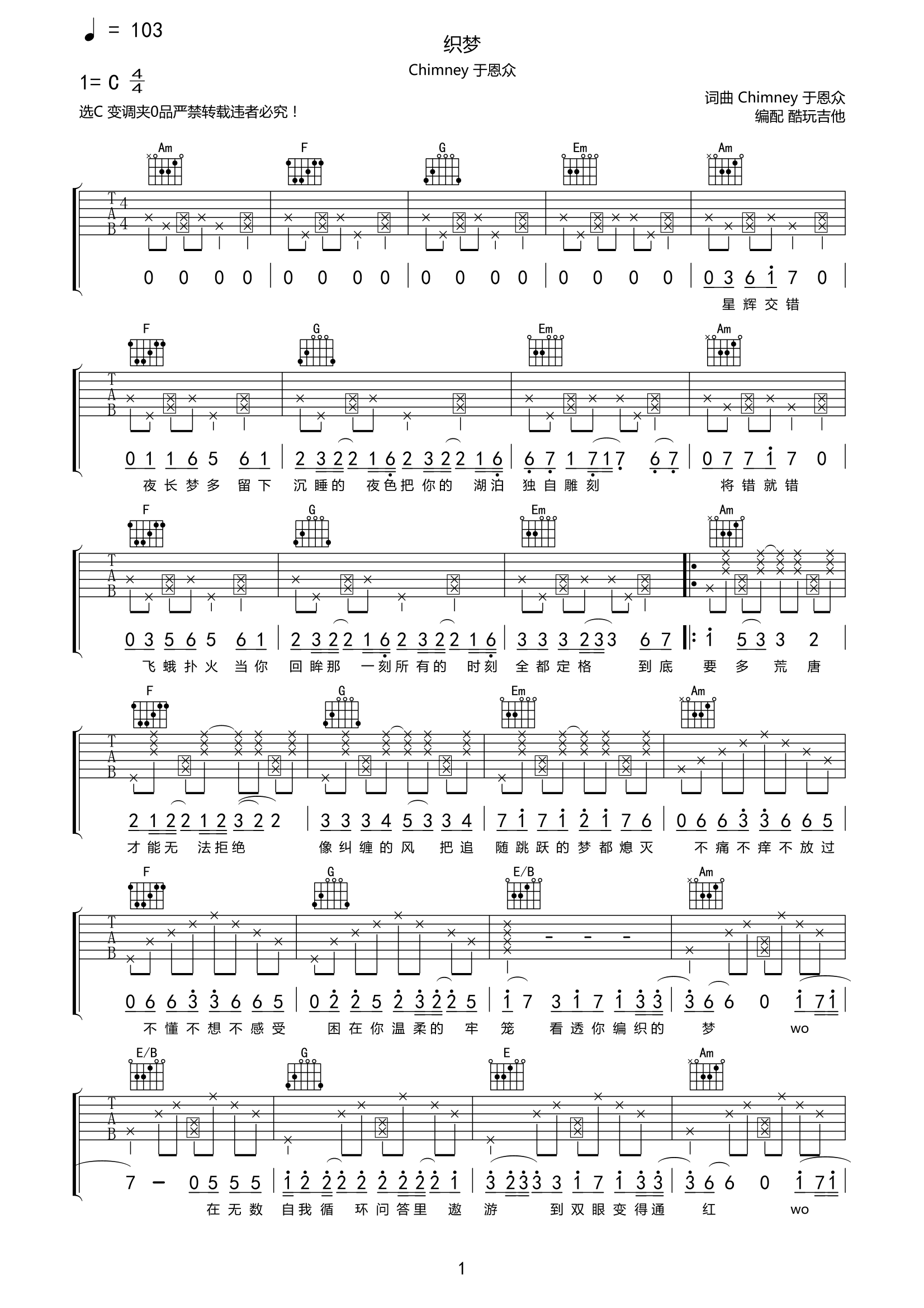 于恩重杨可爱《织梦》吉他谱-C六线谱弹唱谱