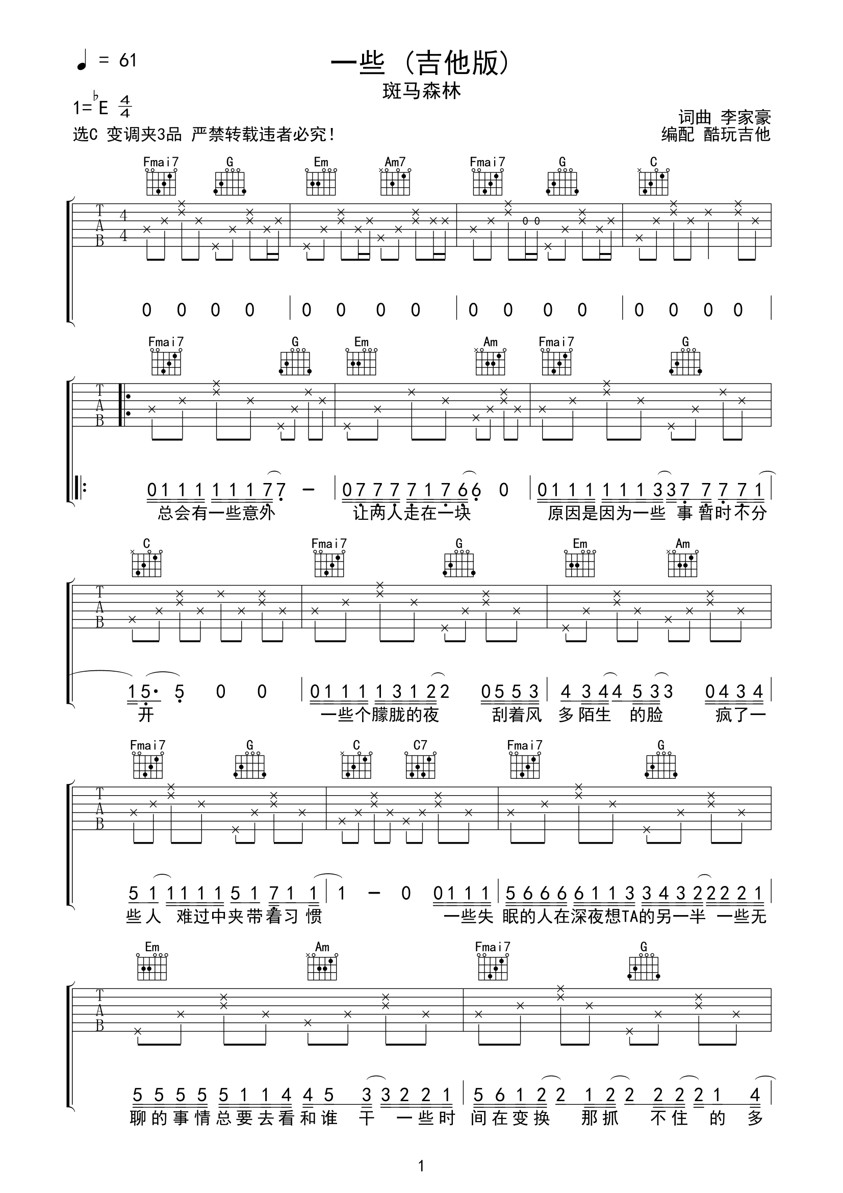 斑马森林《一些》吉他谱-C六线谱弹唱谱