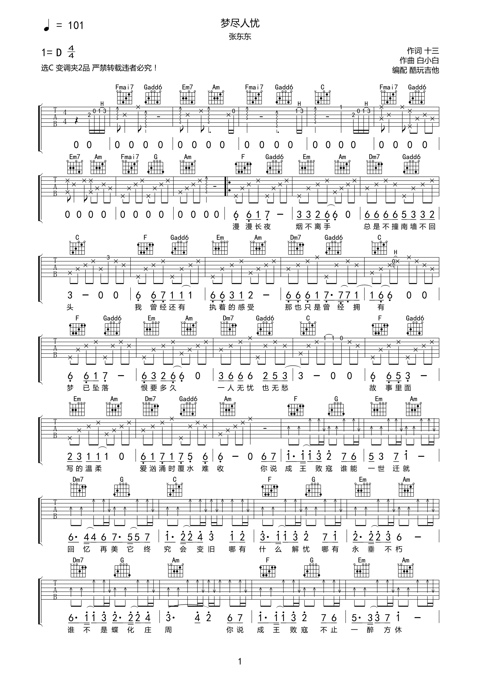 张东东《梦尽人优》吉他谱-C调六线谱弹唱谱