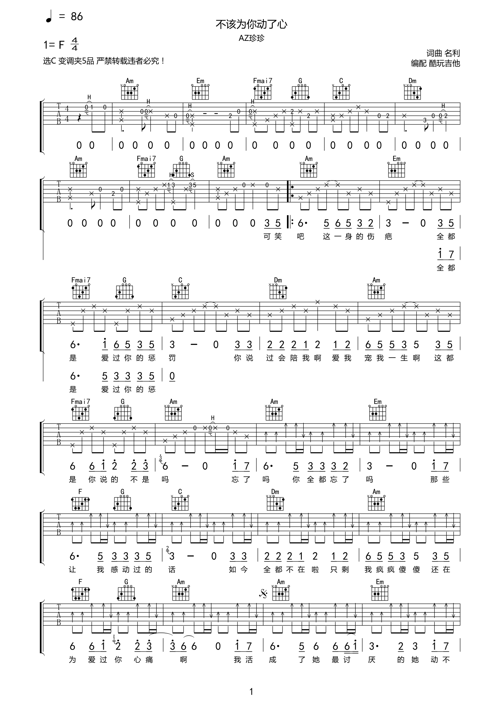 AZ珍珍《不该为你动了心》吉他谱-C调六线谱弹唱谱