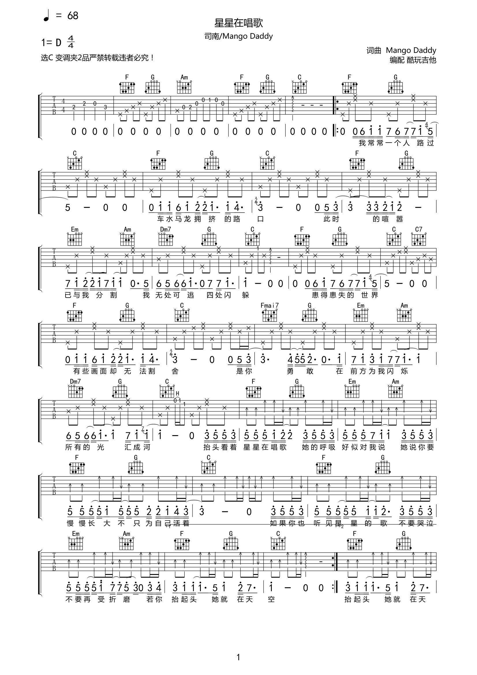 司南《星星在唱歌》吉他谱,采用C调指法编配,共有2张高清图谱,免翻页排版设计。