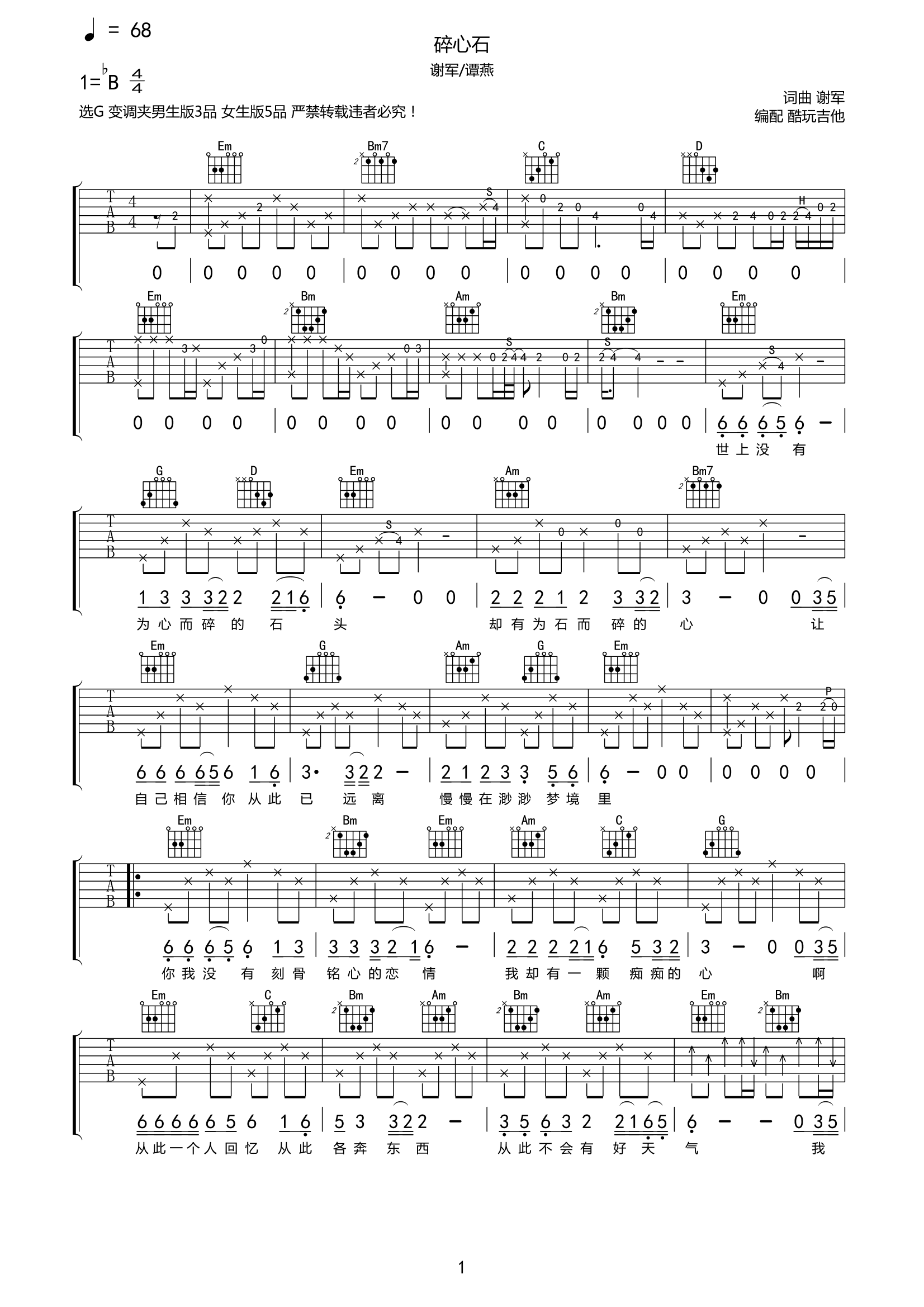 谢军/谭艳《碎心石》吉他谱-G调六线谱弹唱谱