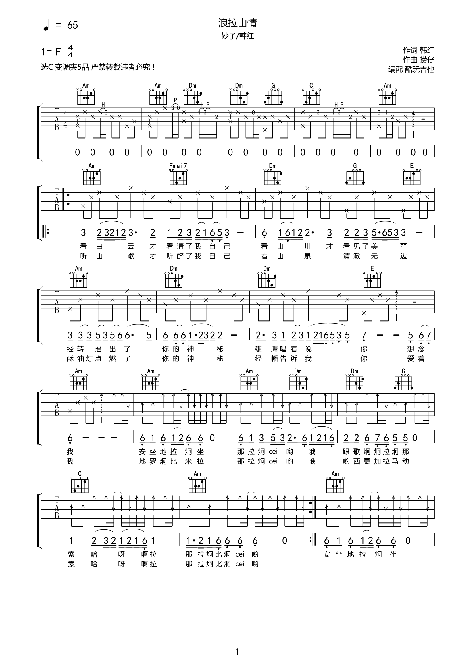 妙子《浪拉山情》吉他谱-C调六线谱弹唱谱
