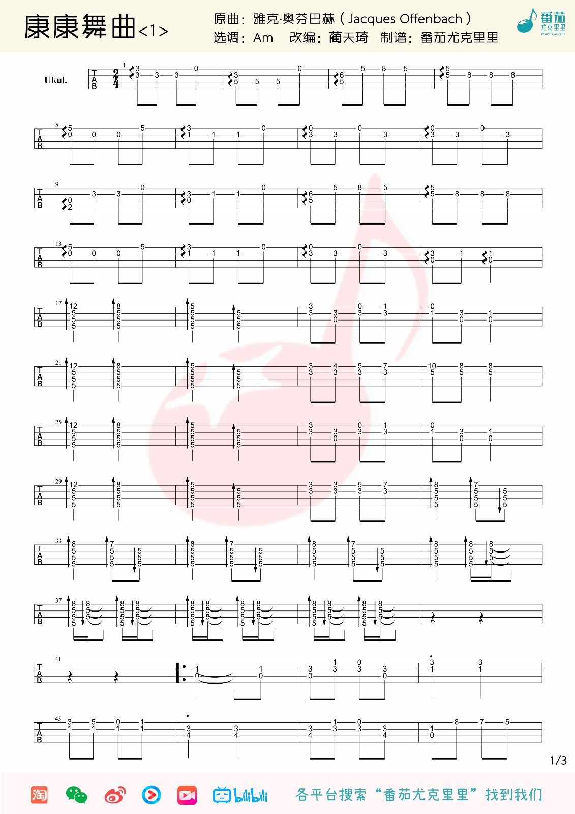 雅克·奥芬巴赫《康康舞曲》尤克里里谱 A调指弹版