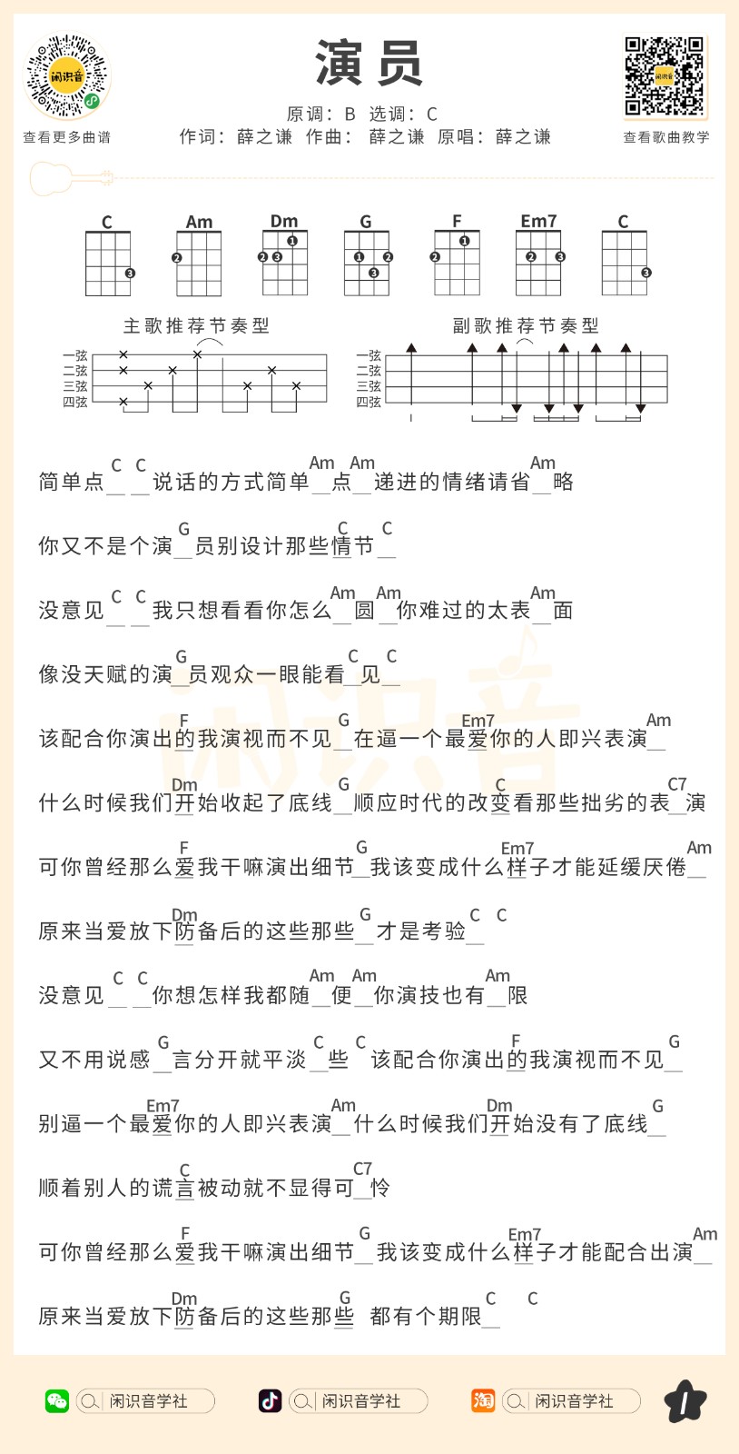 薛之谦《演员》尤克里里谱 C调弹唱版