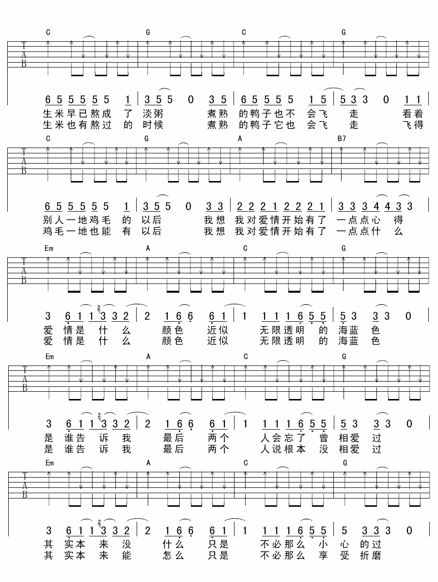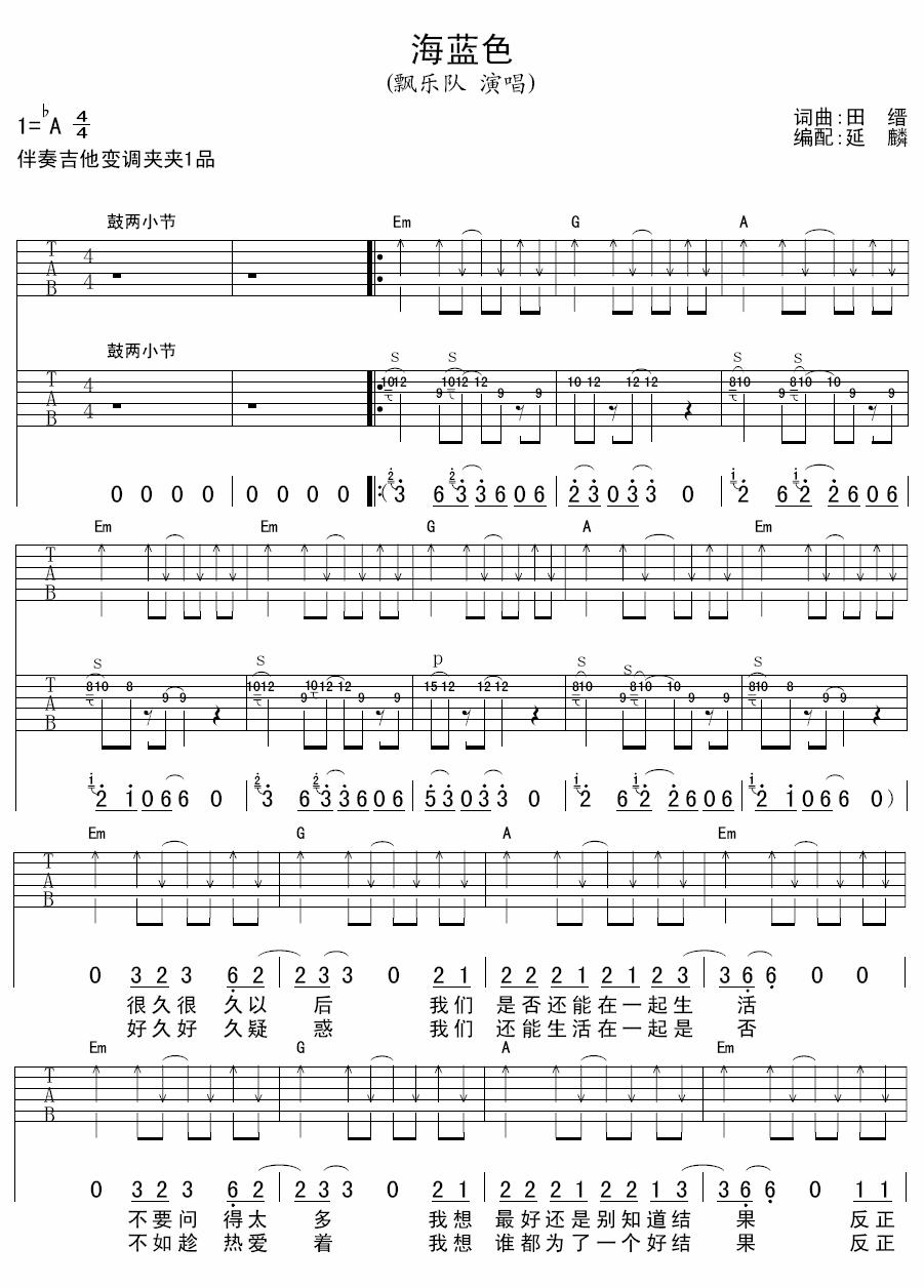 海蓝色吉他谱 A调扫弦版__飘乐队