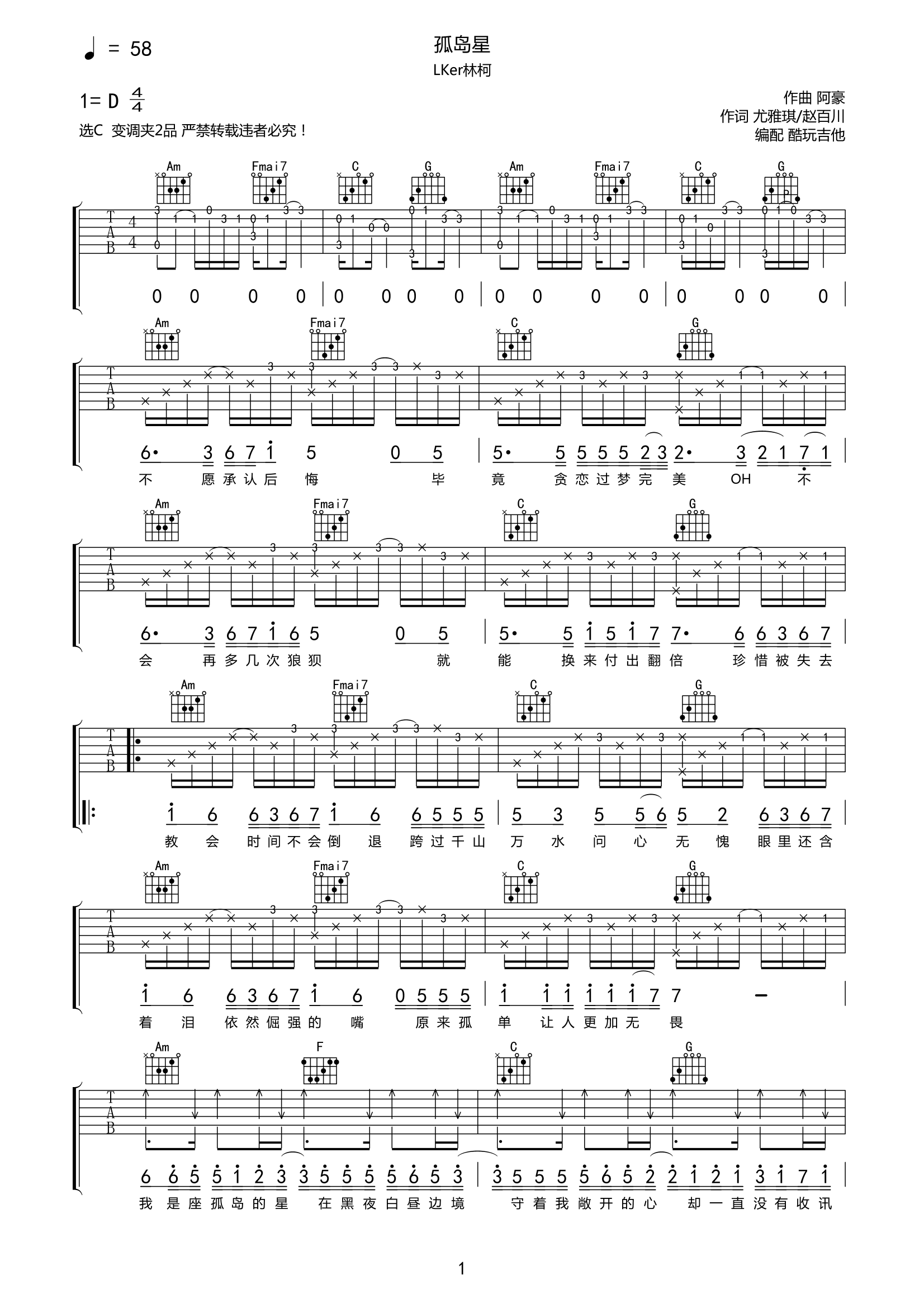 LKer林柯《孤星岛》吉他谱-C调六线谱弹唱谱