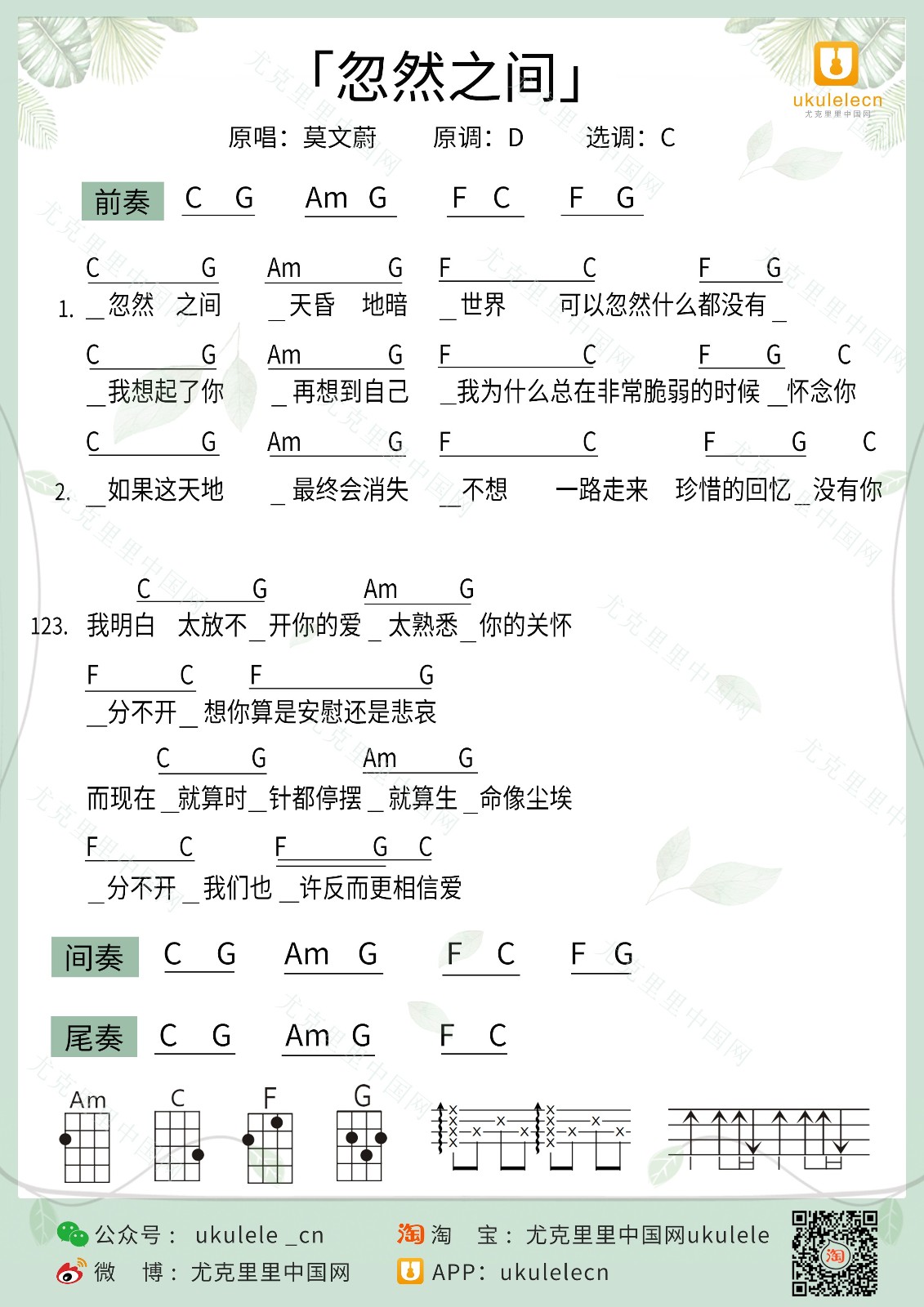 莫文蔚《忽然之间》尤克里里弹唱谱 高清版