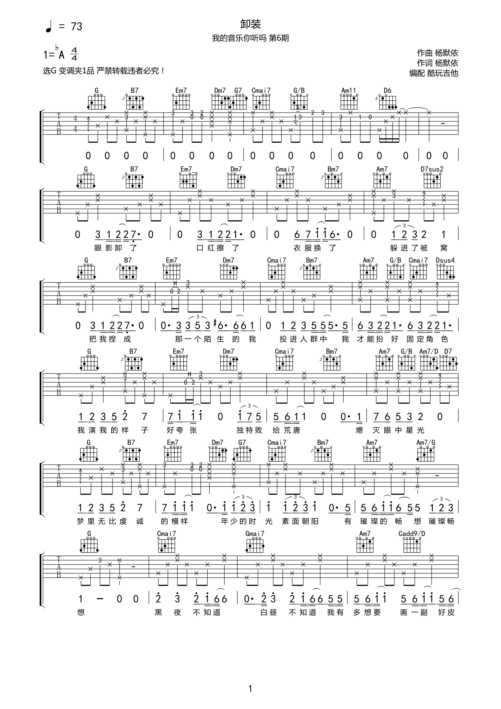 杨默依《卸妆》吉他谱-G调弹唱谱高请六线谱