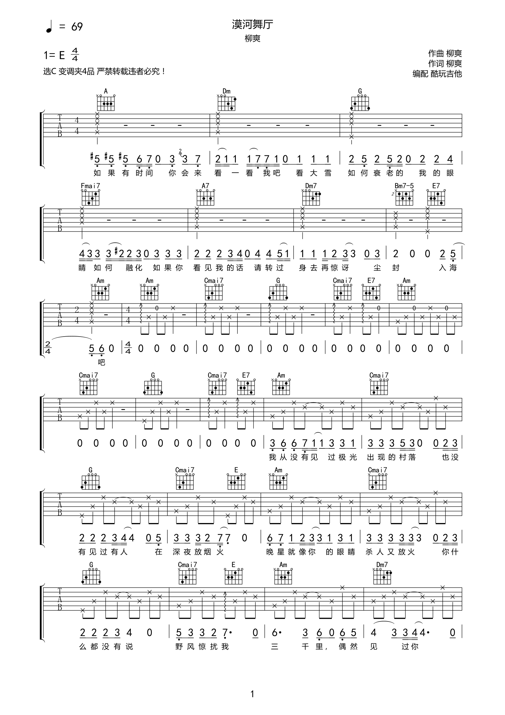 刘爽《漠河舞厅》原版吉他谱-C调弹唱谱高清六线谱