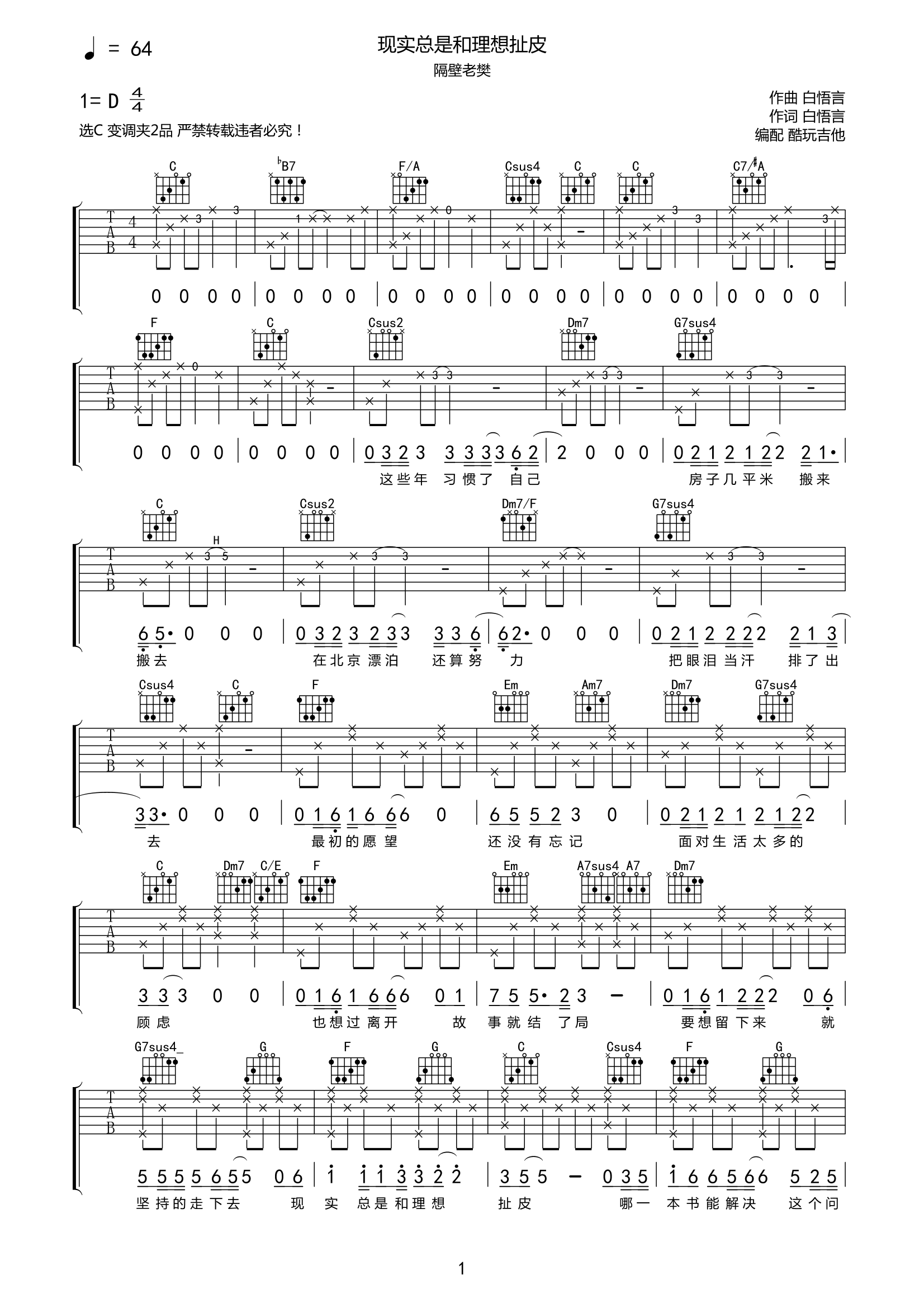 隔壁老樊《现实总是和理想扯皮》吉他谱-C调弹唱谱高清