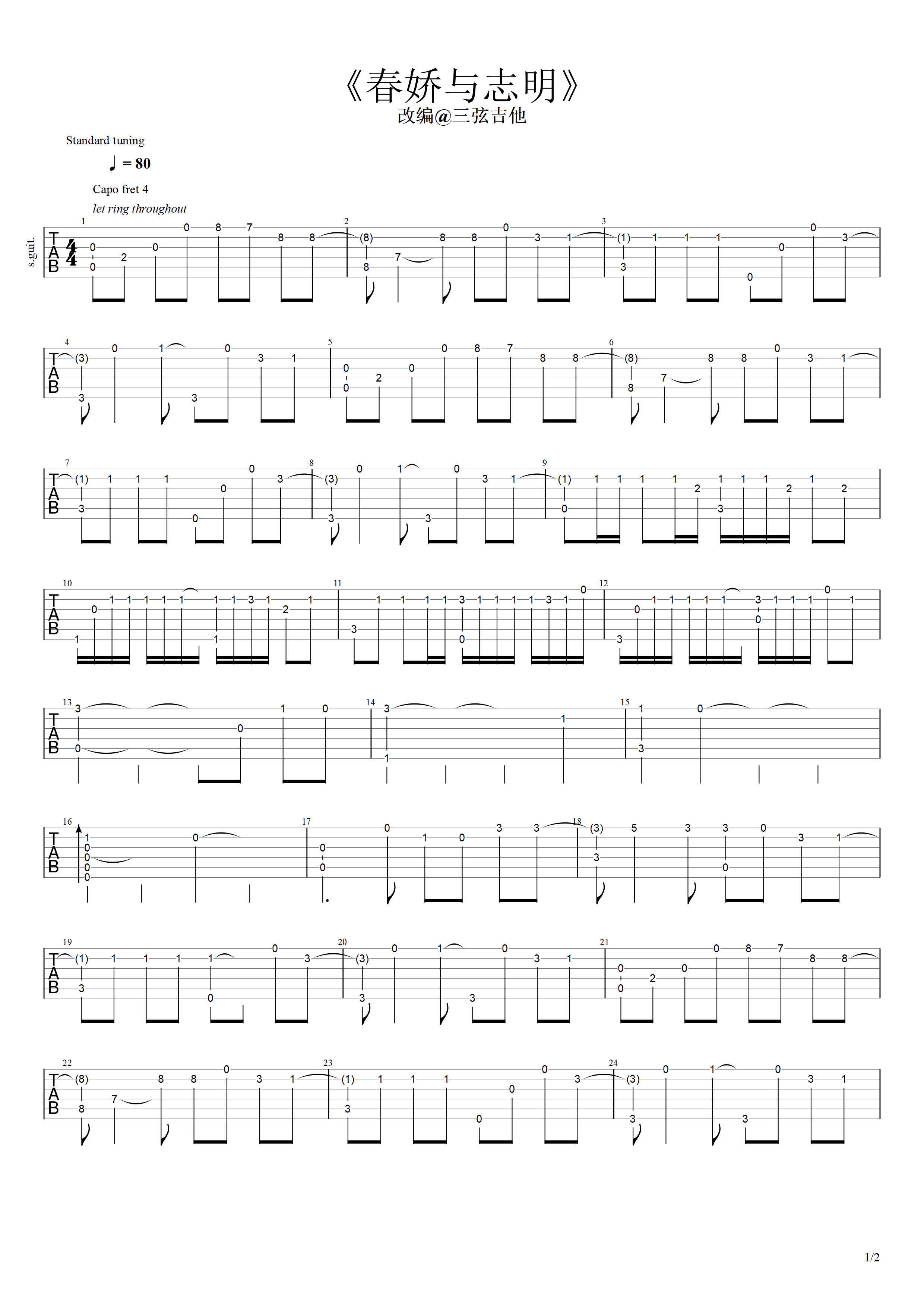 志明与春娇指弹谱_五月天_吉他独奏谱_六线谱