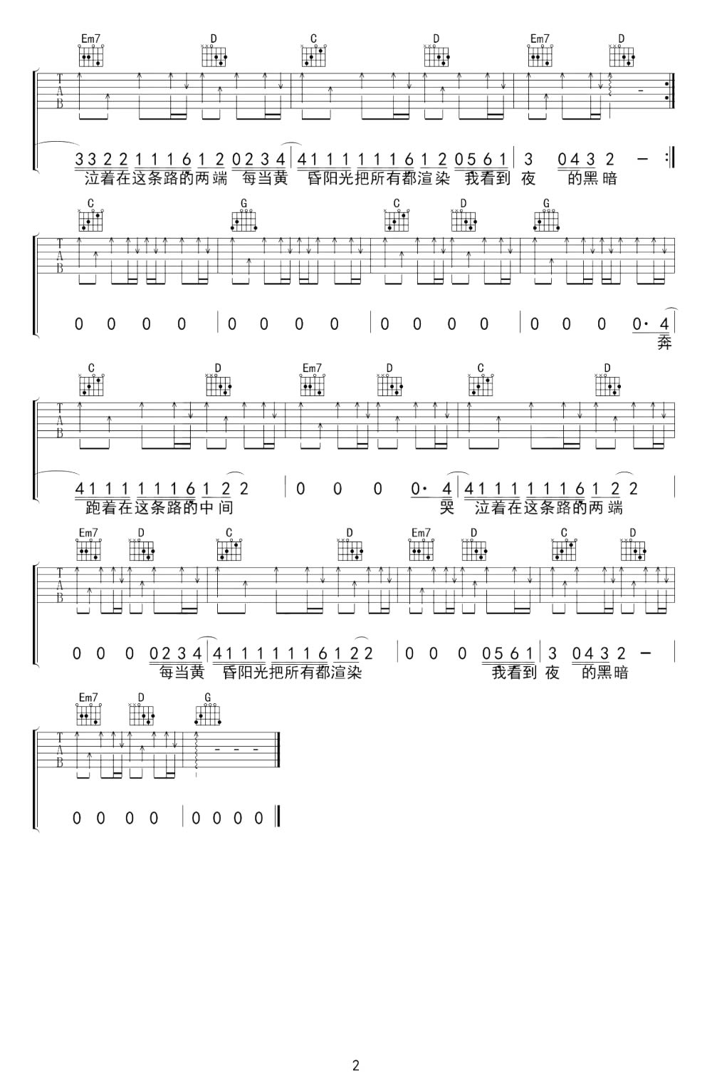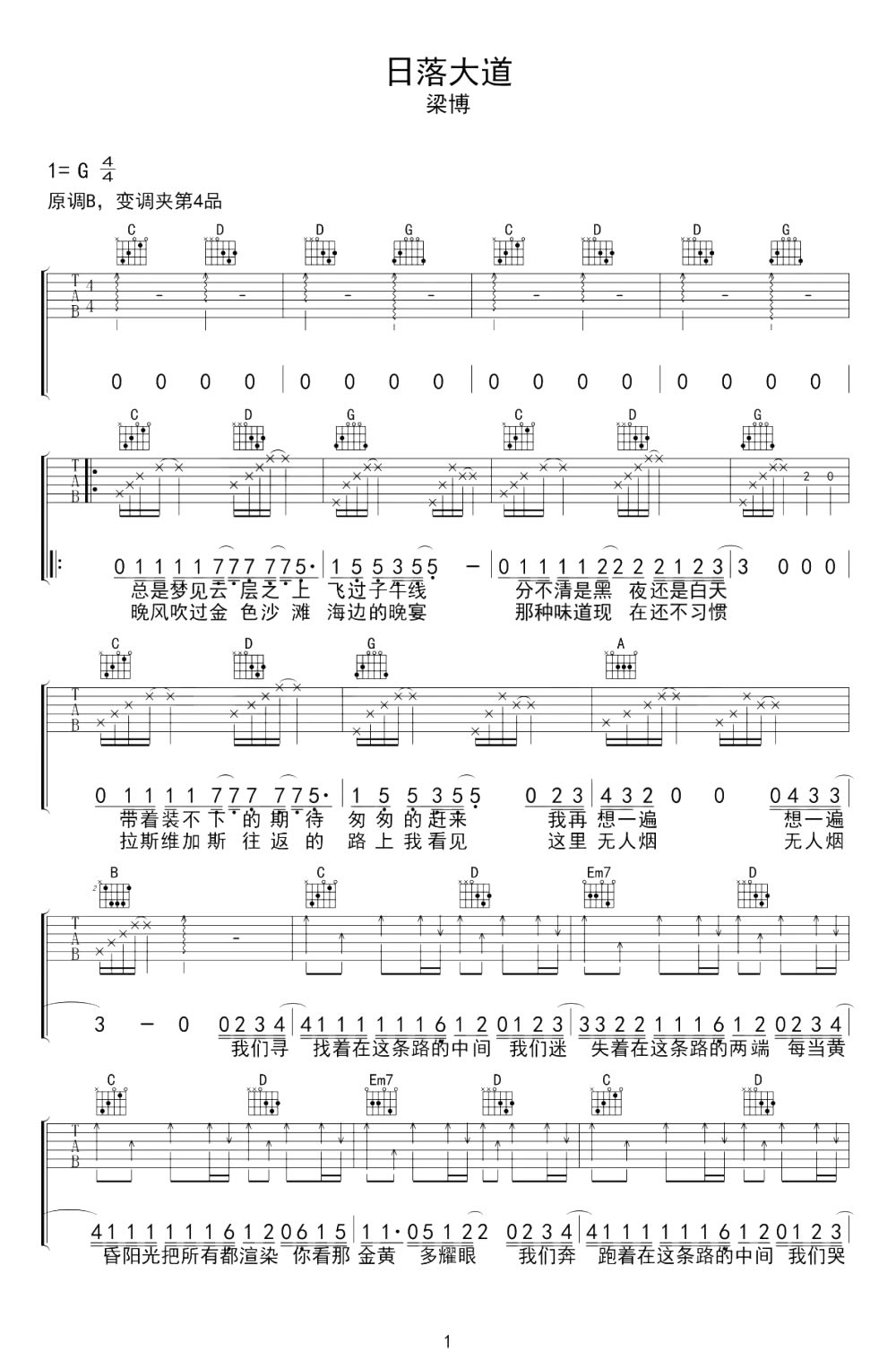 日落大道吉他谱_梁博_G调弹唱谱_高清六线谱