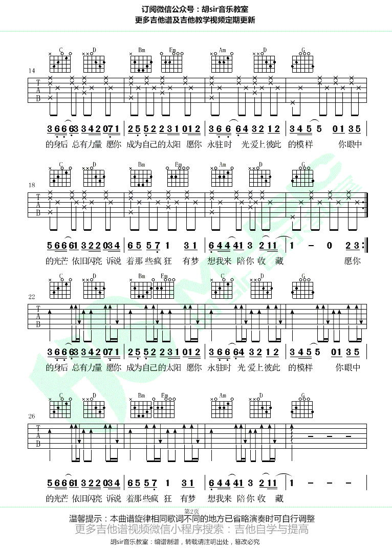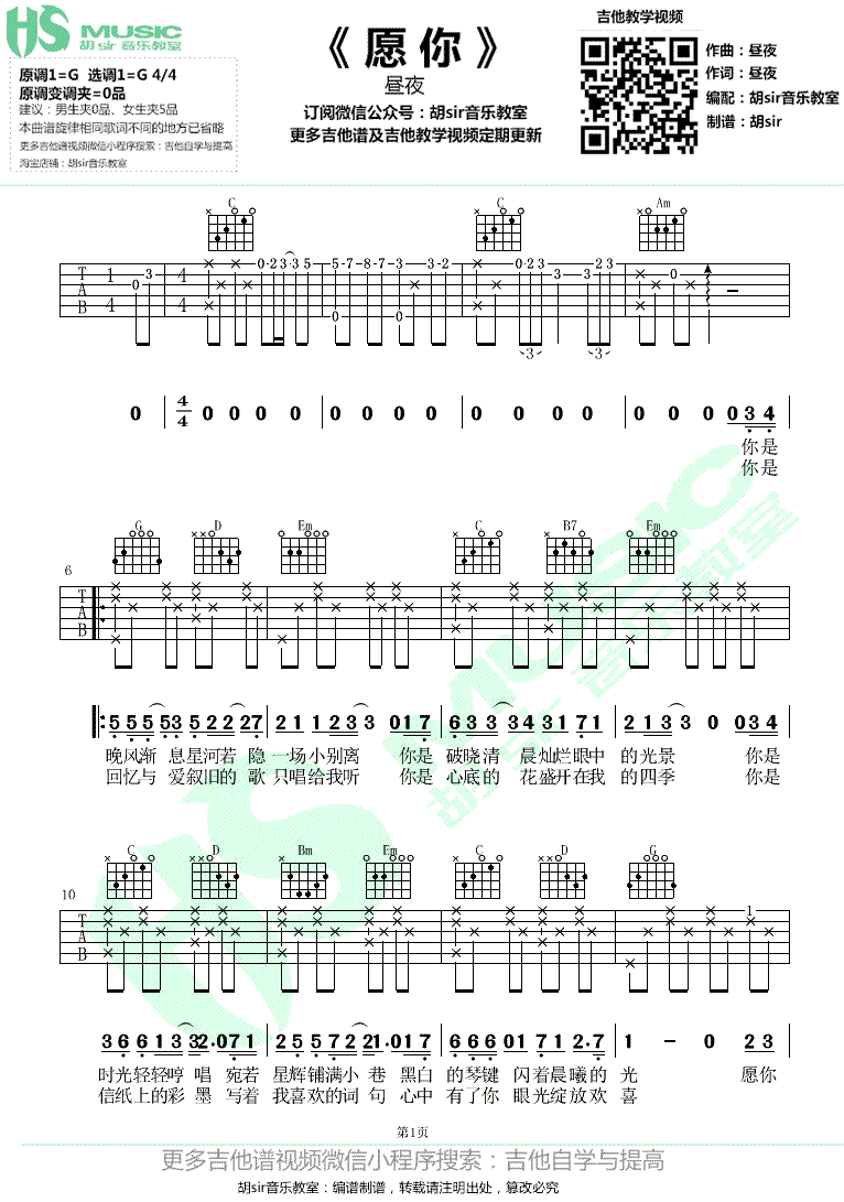 - 昼夜《愿你》吉他谱 G调弹唱谱 图片谱