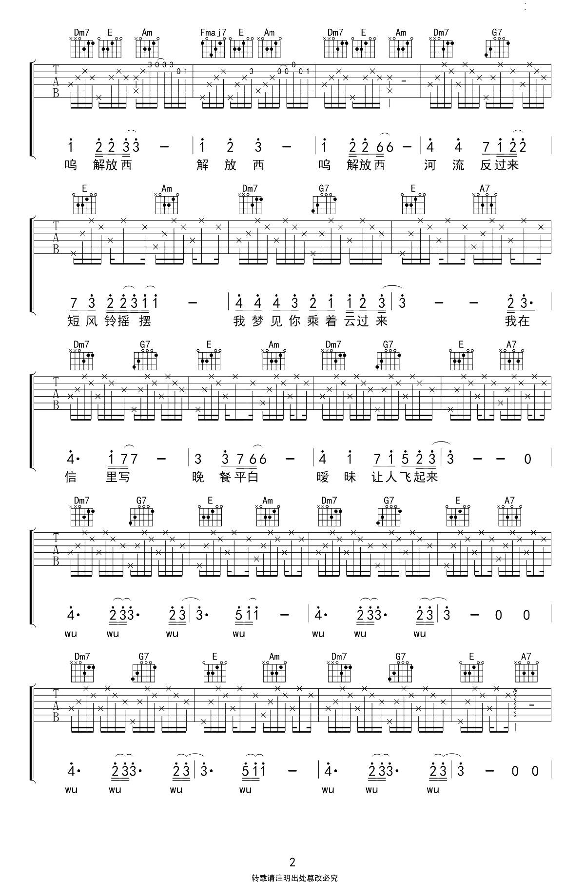 我的解放西吉他谱_柳爽_C调弹唱谱_原版六线谱《我的解放西》吉他弹唱谱,原调D,选用C调指法,变调夹夹第二品,三张图片六线谱。