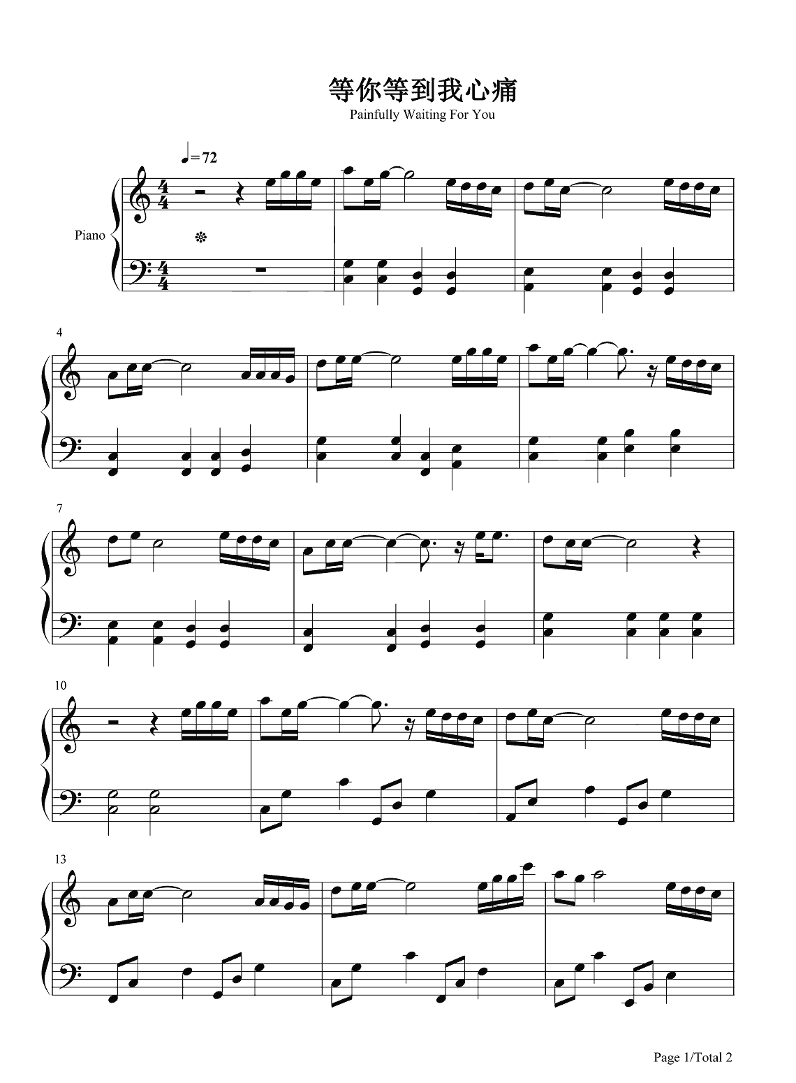 张学友《等你等到我心痛》钢琴谱...