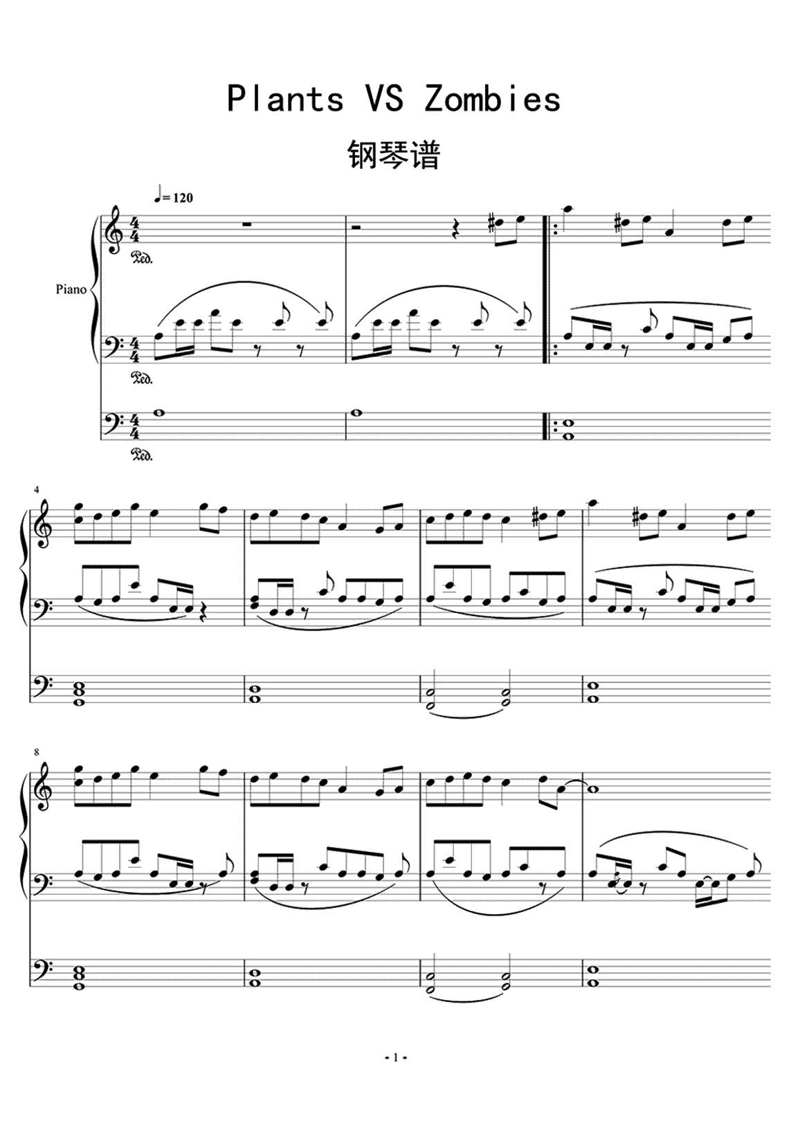 钢琴《植物大战僵尸》钢琴谱