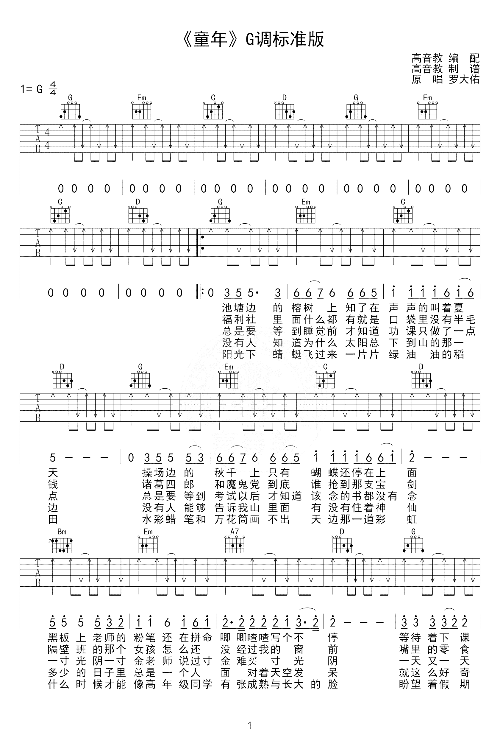 吉他罗大佑《童年》吉他谱_吉他弹唱谱_高音教编配