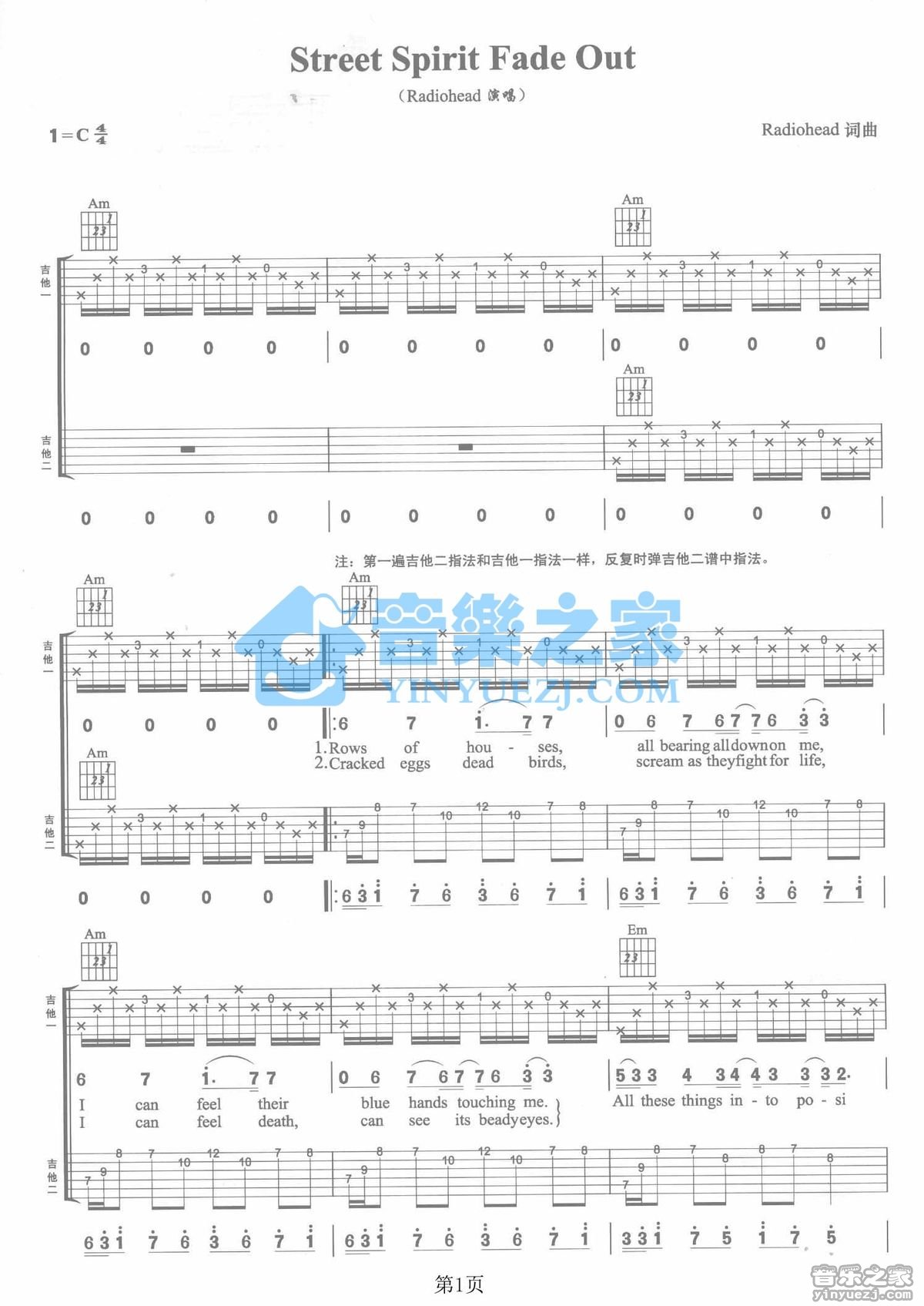 C调双吉他版Radiohead《StreetSpirit》吉他弹唱六线谱...