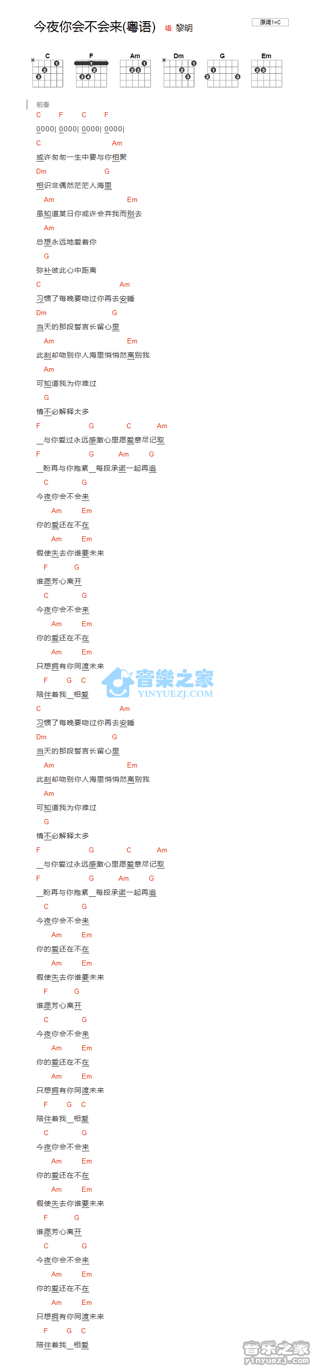 C调版《今夜你会不会来》吉他和弦弹唱谱...